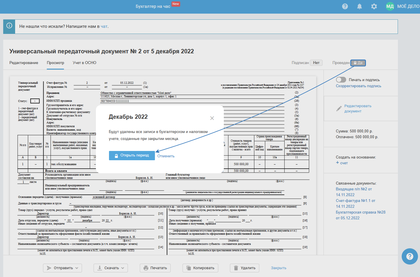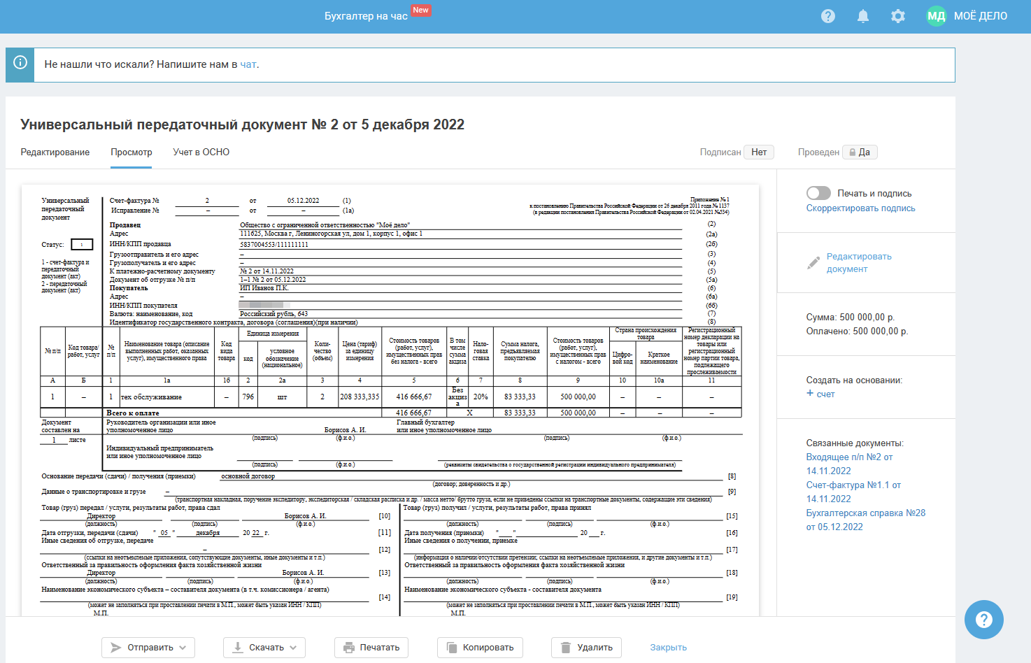После нажатия у вас откроется выбранный документ во вкладке «Документы и ЭДО — Продажи»: