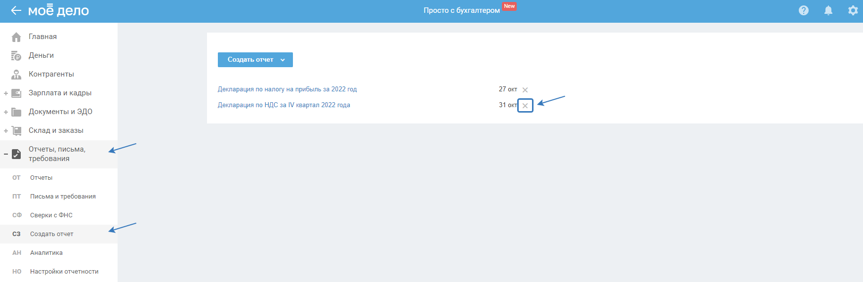 Если были внесены исправления в сервис, удалите отчёт из вкладки «Отчёты, письма, требования — Создать отчёты» (нажмите на крестик напротив названия отчёта) и создайте новый отчёт:
