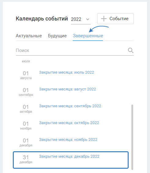Также открыть месяцы можно с помощью Календаря событий. Для этого на главной странице в Календаре событий нажмите «Завершённые» и откройте нужные месяцы: