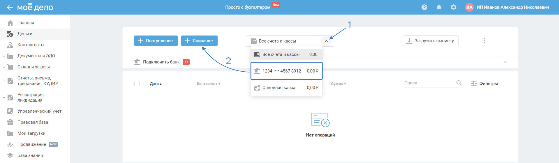 В разделе «Деньги» нажмите «Все счета и кассы» и выберите один из расчётных счетов, созданных в разделе «Реквизиты»: