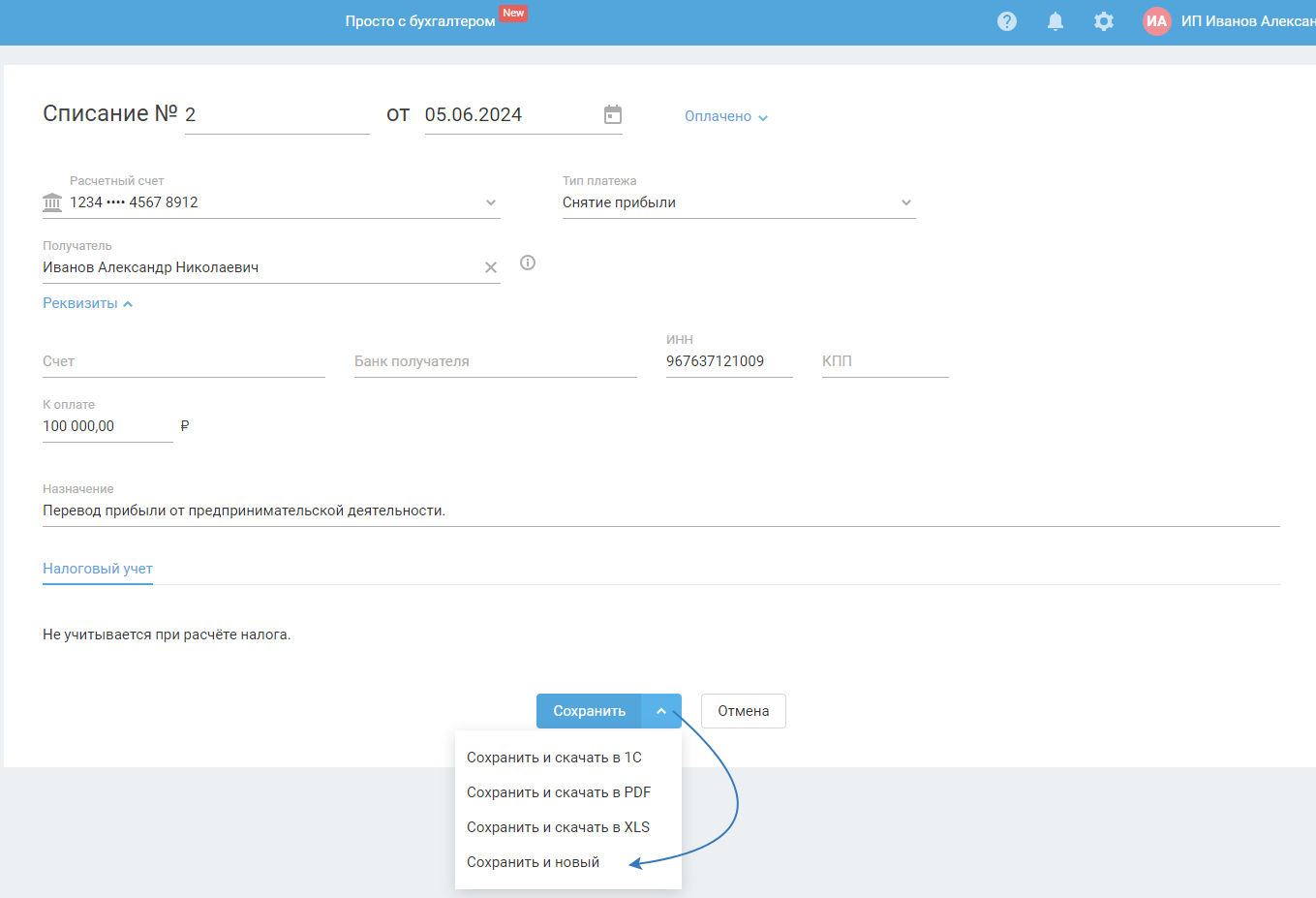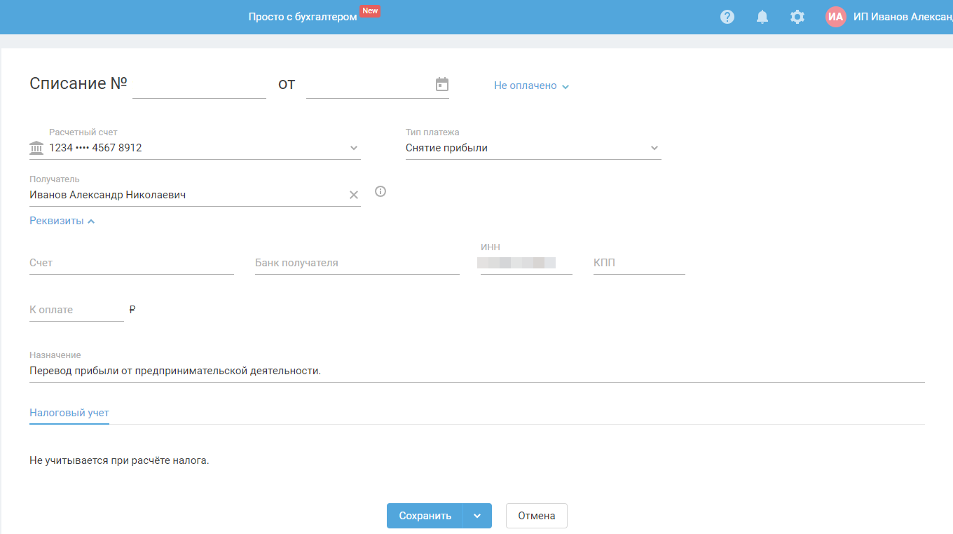 — Получатель. Поле доступно при переводе прибыли безналичным путём с расчётного счёта. В поле автоматически подставляется ФИО самого ИП.