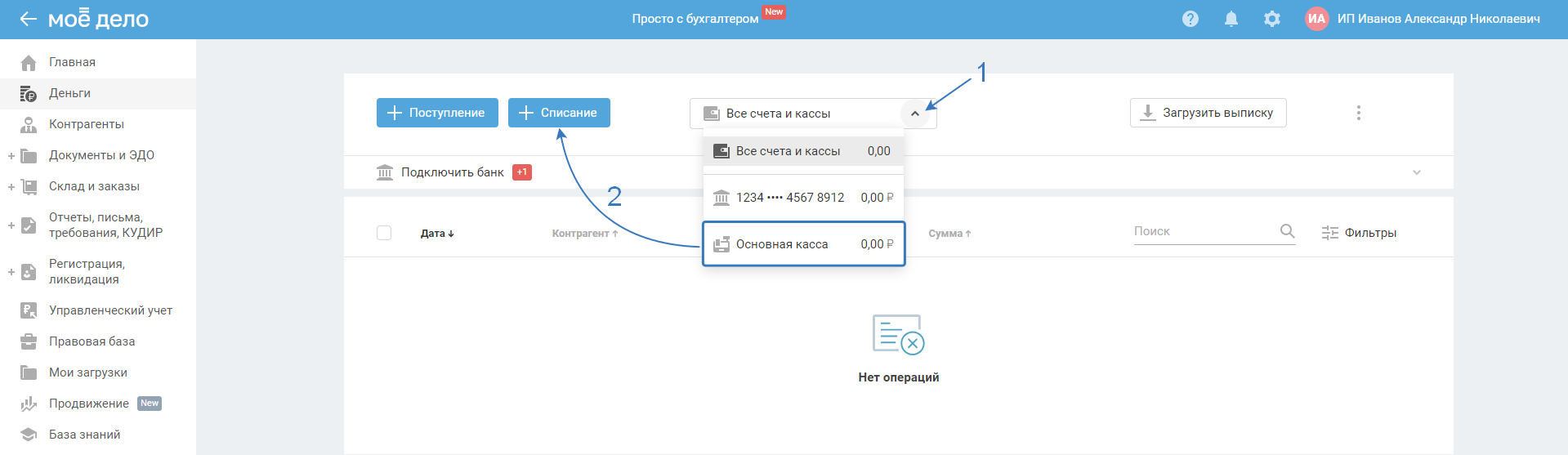 В разделе «Деньги» нажмите «Все счета и кассы» и выберите одну из касс (по умолчанию используется «Основная касса»), созданных в разделе «Реквизиты»: