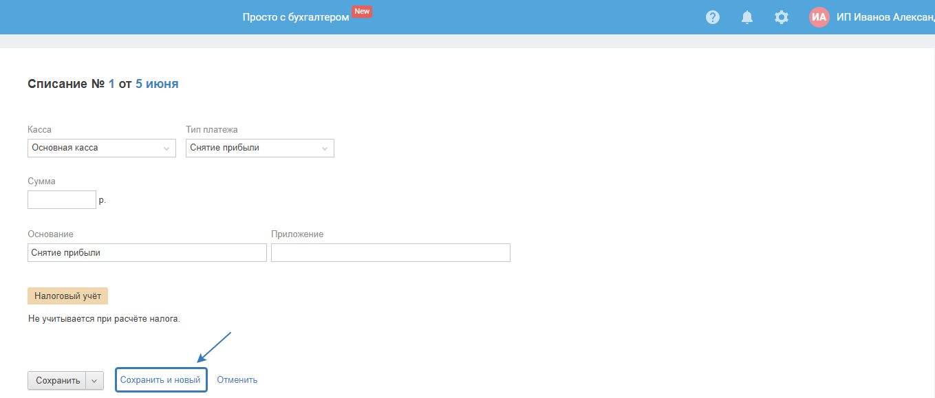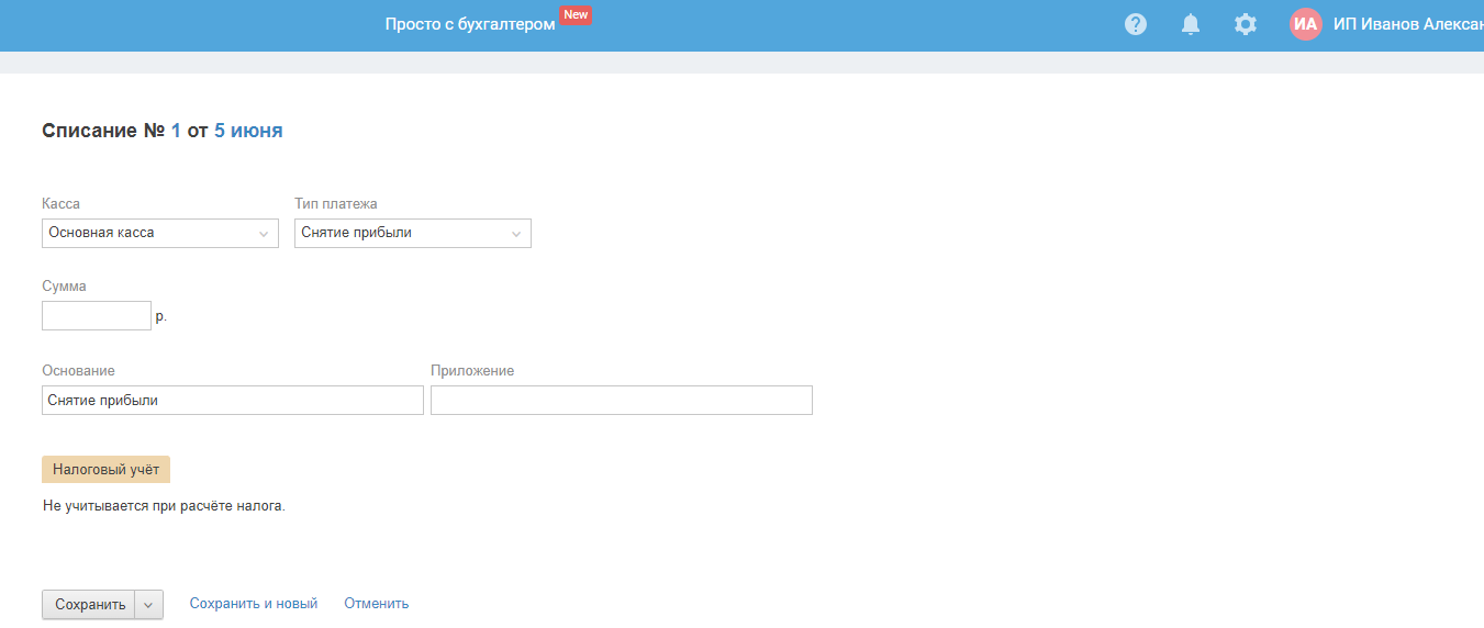 Данный тип списания используется для ввода информации о снятии ИП полученных от ведения деятельности денежных средств. ИП может как снять их наличными с р/сч ИП или забрать из кассы после её закрытия, так и перевести на личную карту. Прибыль можно снять в любой момент. При этом налог на доходы физ. лица (НДФЛ) уплачивать не надо. Отчитываться за снятую прибыль также не требуется.
