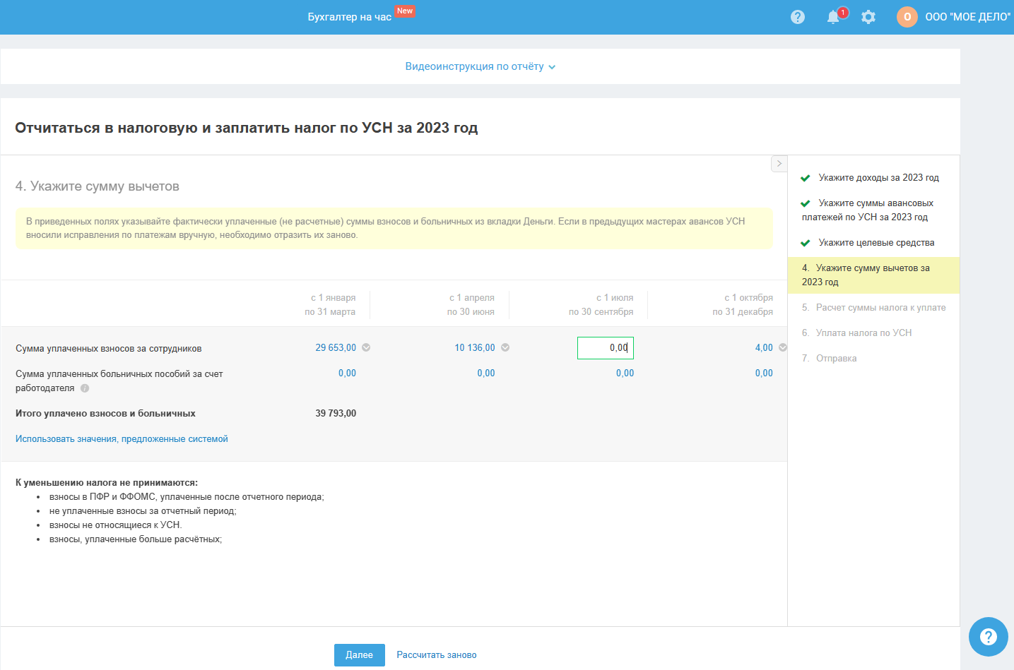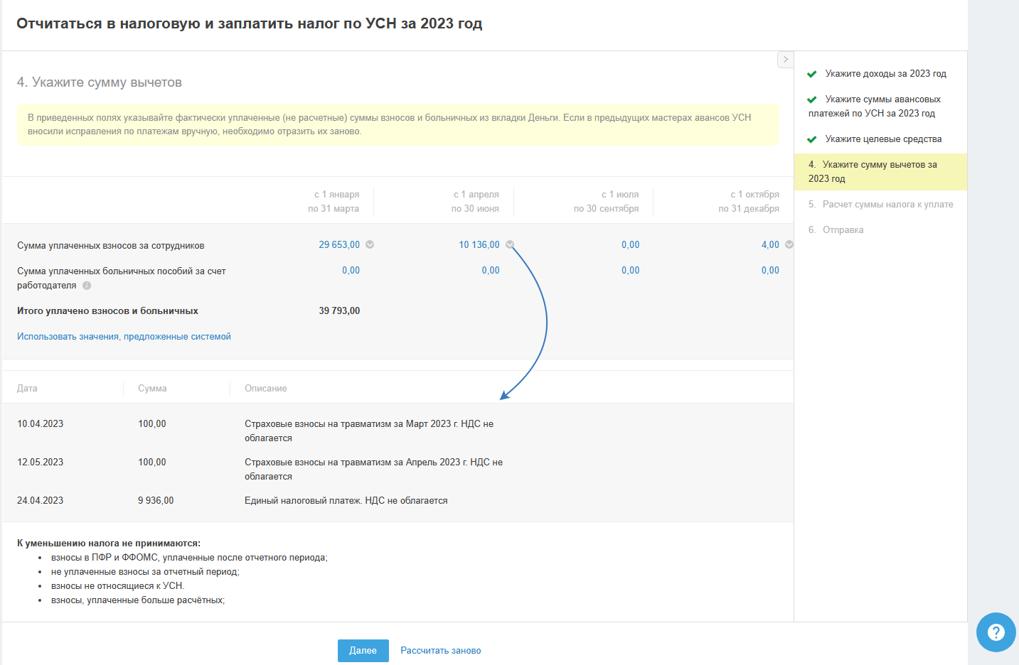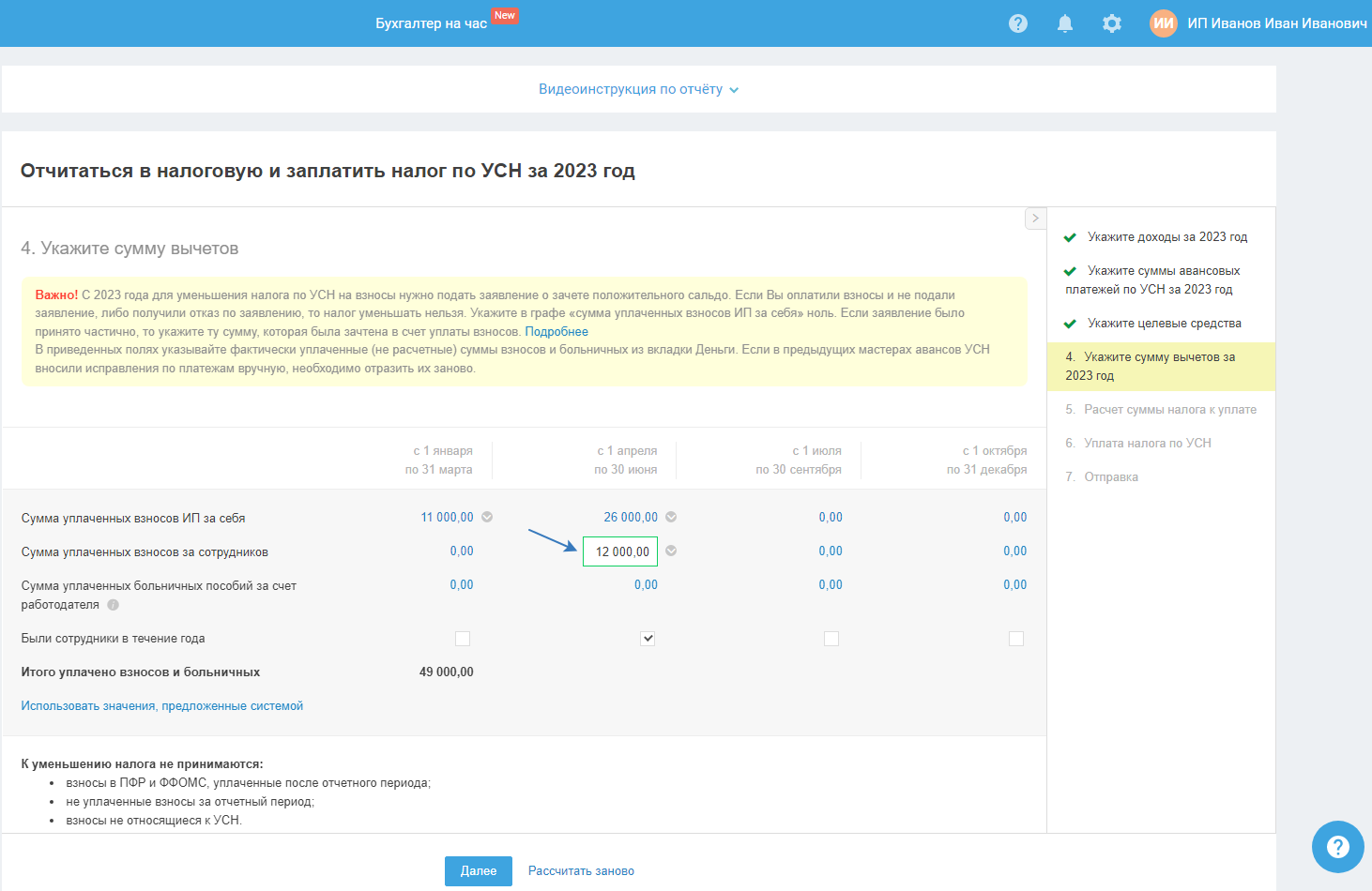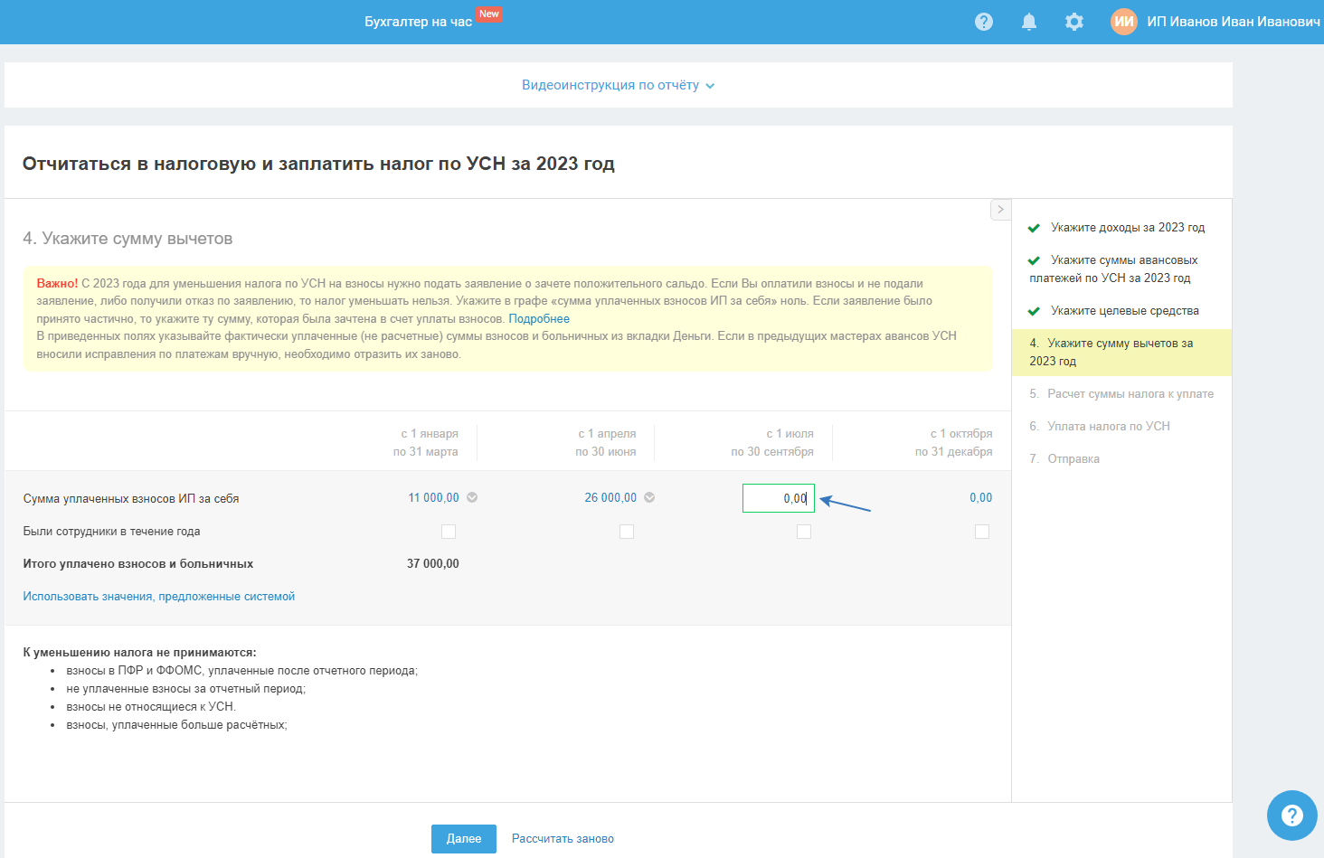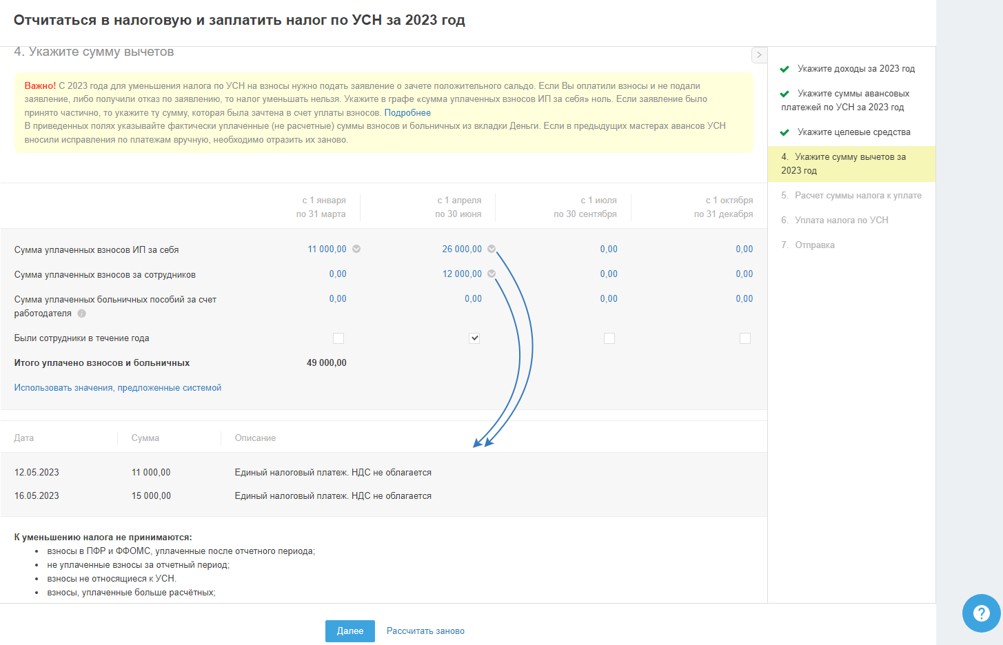 При необходимости вы можете изменить данные по уплаченным взносам в таблице шага, нажав на нужную сумму и указать верную. После нажмите «Enter».