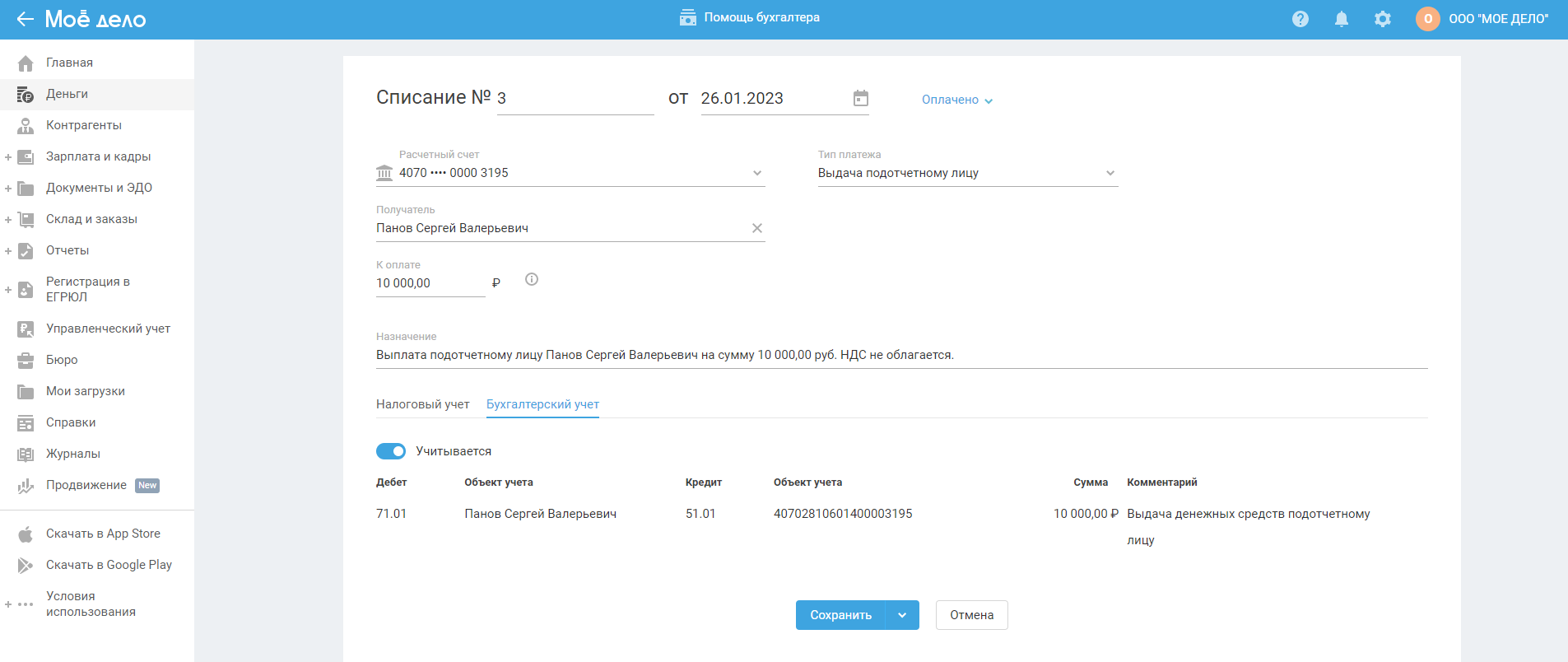 1. В разделе Деньги, выбрав нужный р/сч, добавьте «Списание — Выдача подотчётному лицу». В поле «Получатель» выберите сотрудника. Отразите сумму и дату выплаты денег сотруднику, в поле «Назначение» укажите удобное для вас описание. Выберите сверху статус «Оплачен» после перевода денег на карту сотрудника. Сохраните.