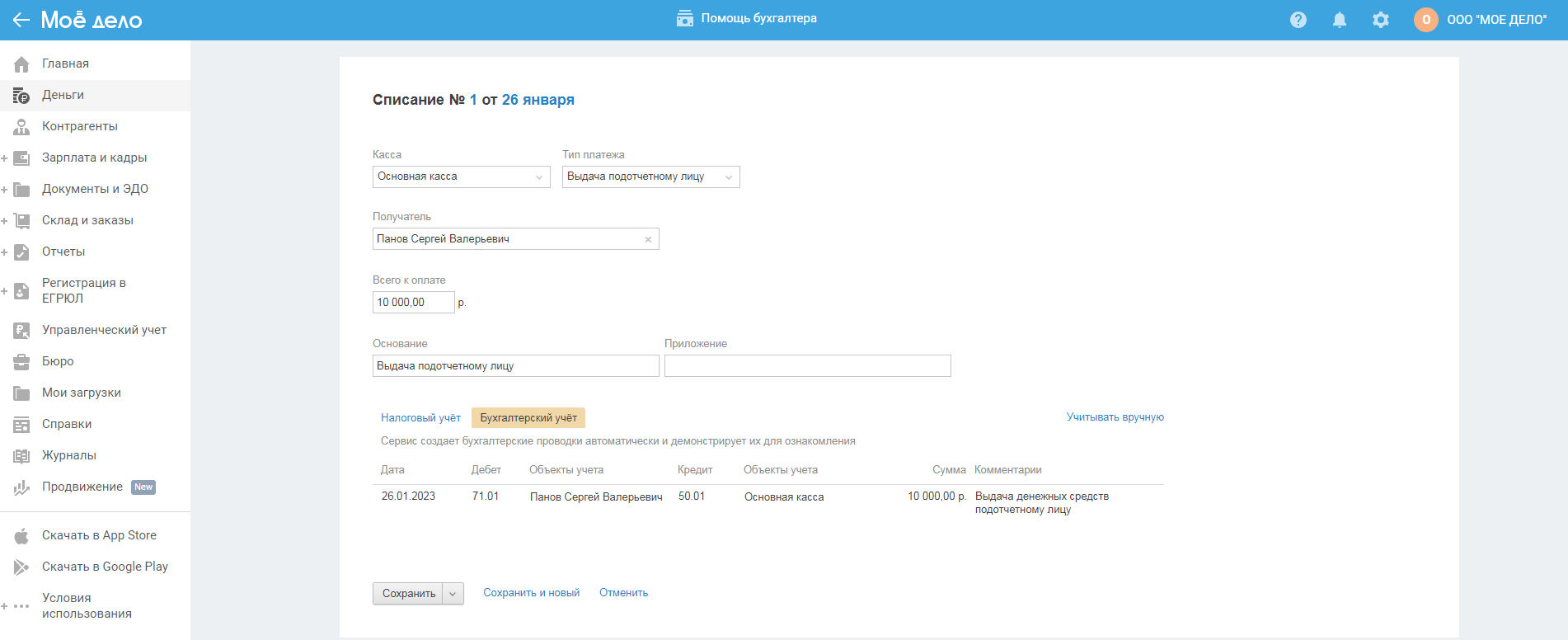 2. В разделе Деньги добавьте «Списание — Выдача подотчётному лицу» в кассе. В поле «Получатель» выберите сотрудника. Отразите сумму и дату выплаты денег сотруднику. Сохраните.