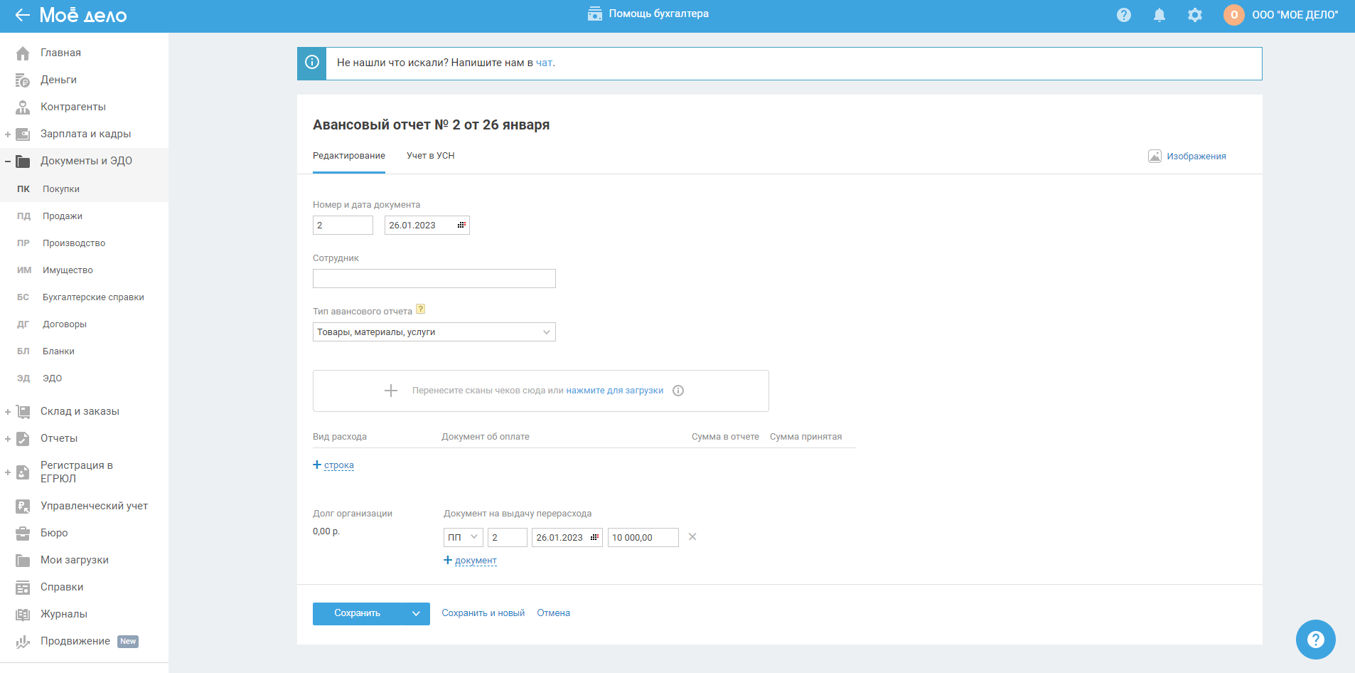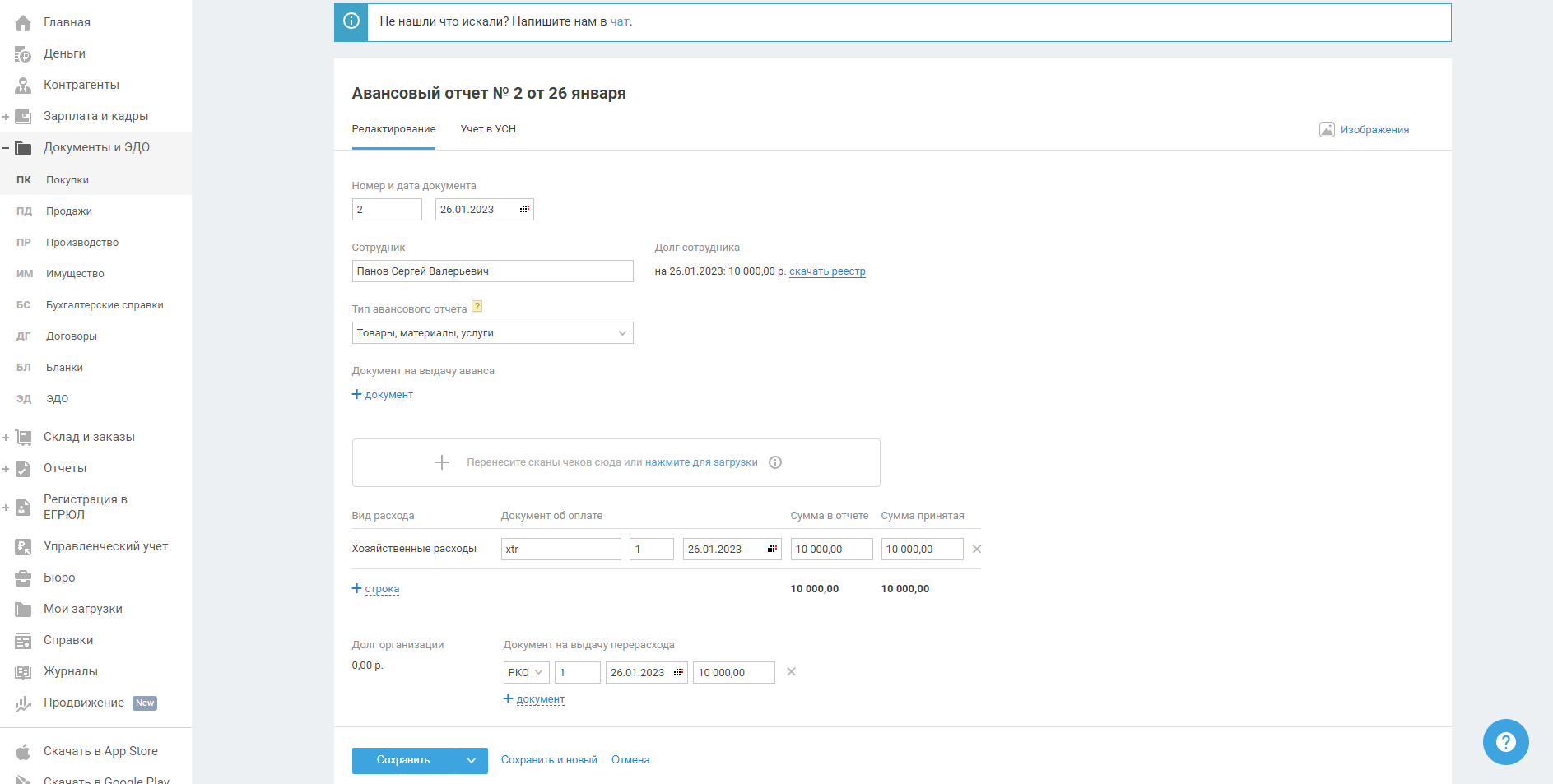 В сервисе во вкладке Документы — Покупки, добавьте «Авансовый отчёт», привязывая к документу на выдачу аванса. В поле «Вид расхода» выберите нужный, на который сотрудник потратил деньги. В поле «Документ об оплате» внесите наименование платёжного документа, которым оплачивал сотрудник затраты (например, кассовый чек), а так же номер и дату. В поле «Сумма в отчёте» отразите ту сумму, которую потратил сотрудник. В поле «Сумма принятая» отразите значение, которое можно учесть в расчёте налога (и если есть подтверждающие документы).