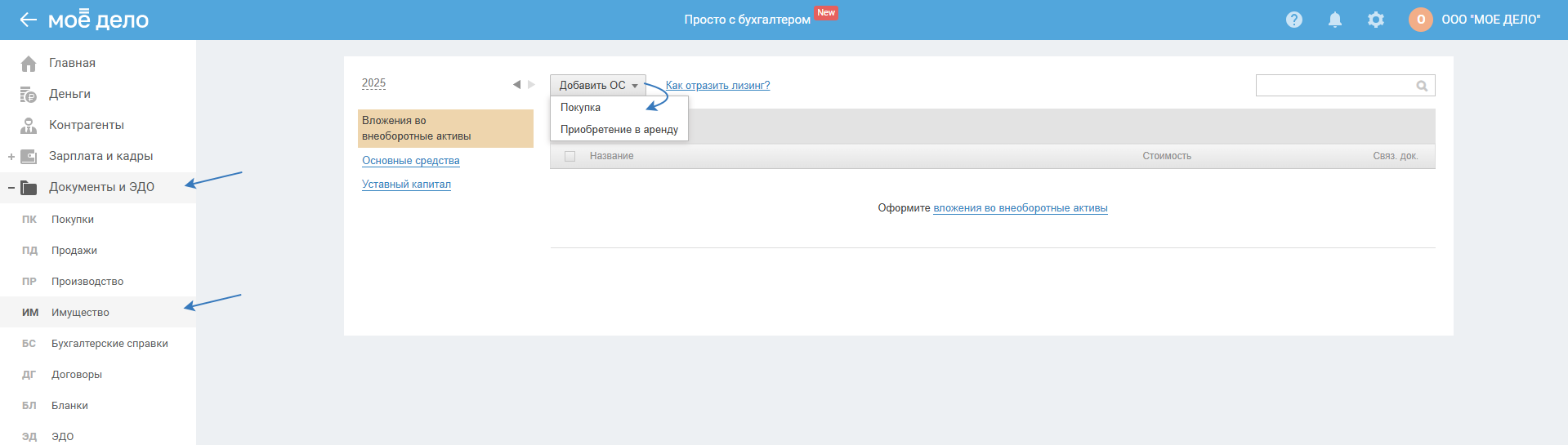 Если имущество стоит более 100 000р., отразите в сервисе покупку следующим образом:
