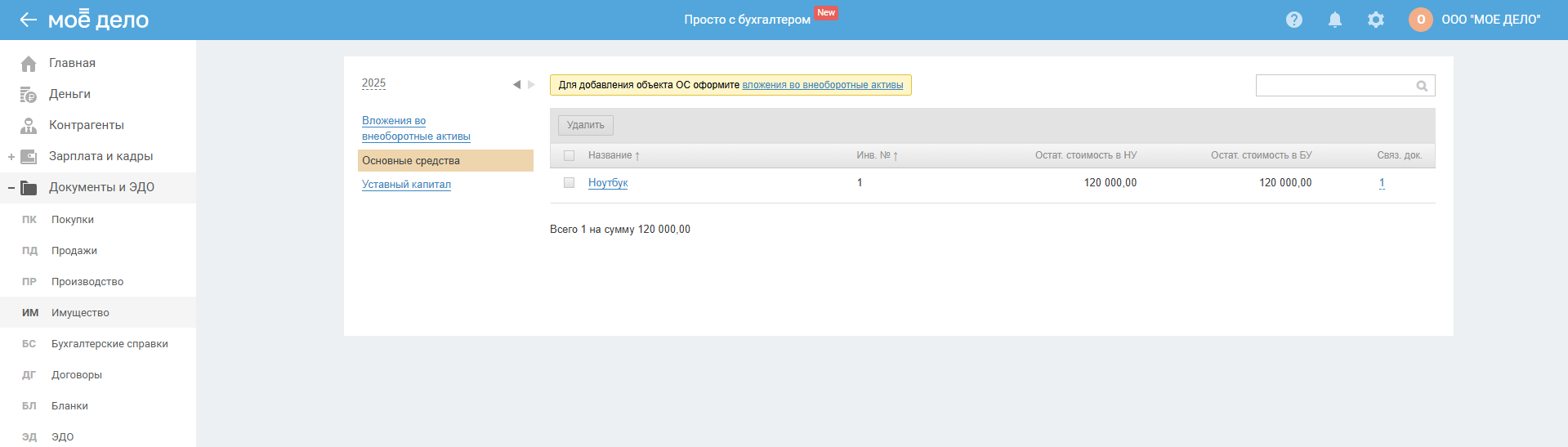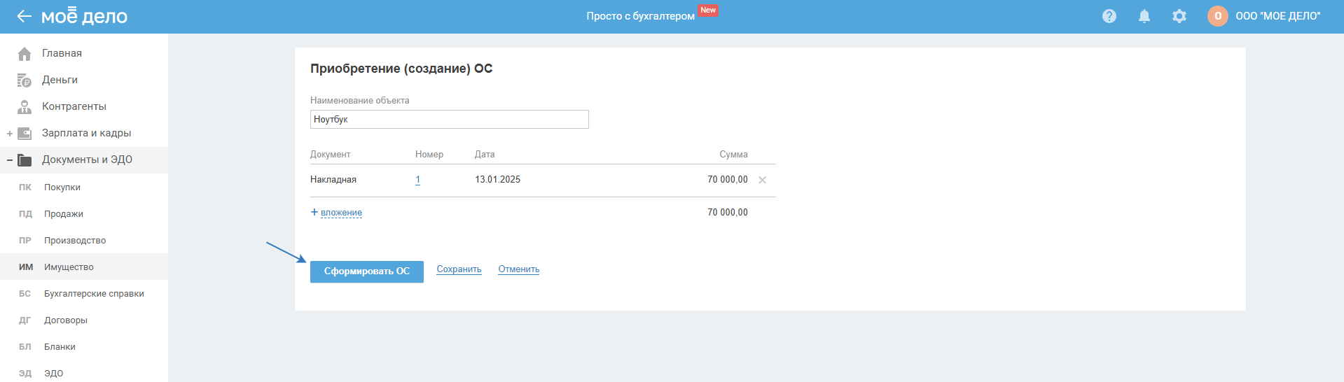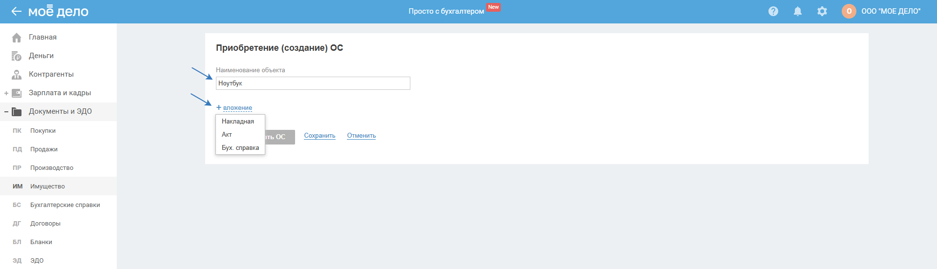 В разделе «Документы и ЭДО» имущество нужно нажать «Добавить ОС», указать его наименование, далее нажать «+ вложения», выбрать накладную, заполнить её на основе имеющегося кассового чека (товарного чека или накладной), далее нажать «сформировать ОС» и заполнить инвентарную карточку.