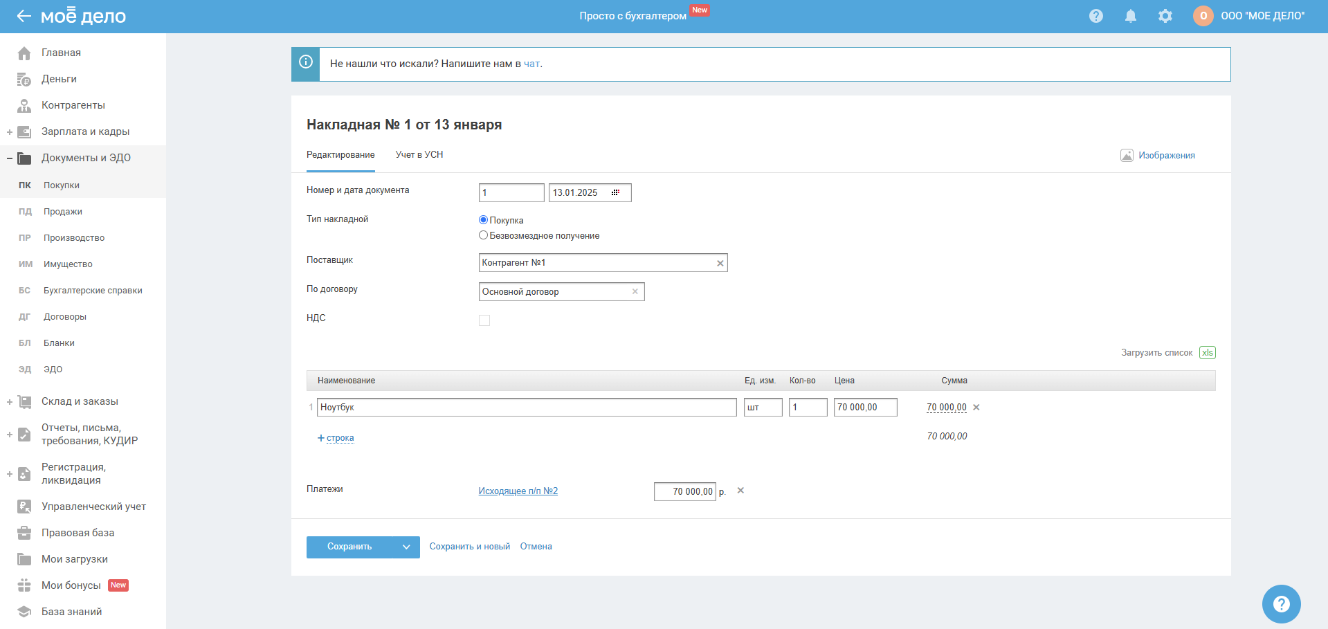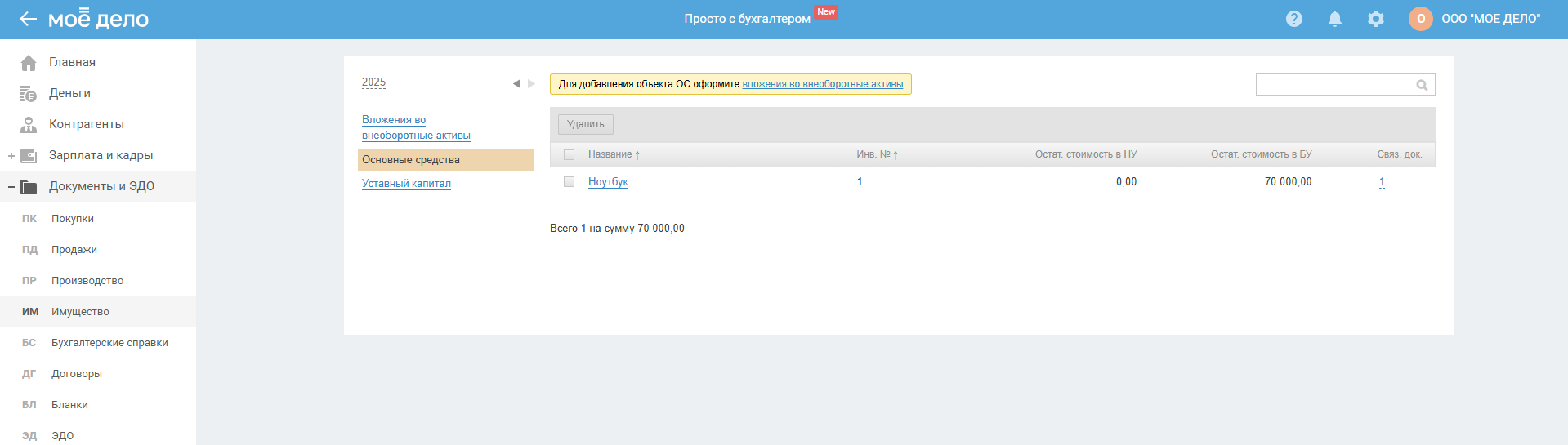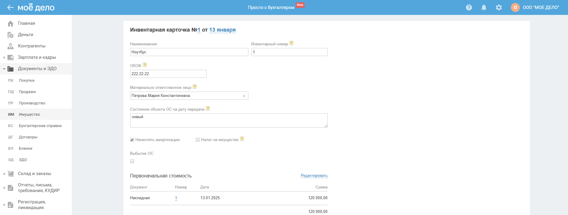 В разделе «Документы и ЭДО» имущество нужно нажать «Добавить ОС», указать его наименование, далее нажать «+ вложения», выбрать накладную, заполнить её на основе имеющегося кассового чека (товарного чека или накладной), далее нажать «сформировать ОС» и заполнить инвентарную карточку.