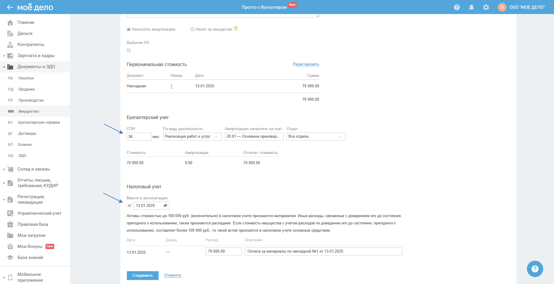 Обратите внимание, если у вас УСН доходы минус расходы или ОСНО, то сервис предупреждает при сохранении о том, что активы стоимостью до 100 000 руб. (включительно) в налоговом учёте признаются материалом. Это означает, что в расчёте налога, расход будет учитываться по правилам учёта материалов (для УСН при условии, что материал получен и оплачен; для ОСНО материал получен).