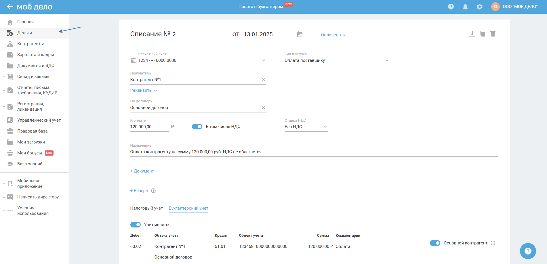 1) Укажите оплату основного средства во вкладке «Деньги — Списание — Оплата поставщику»:
