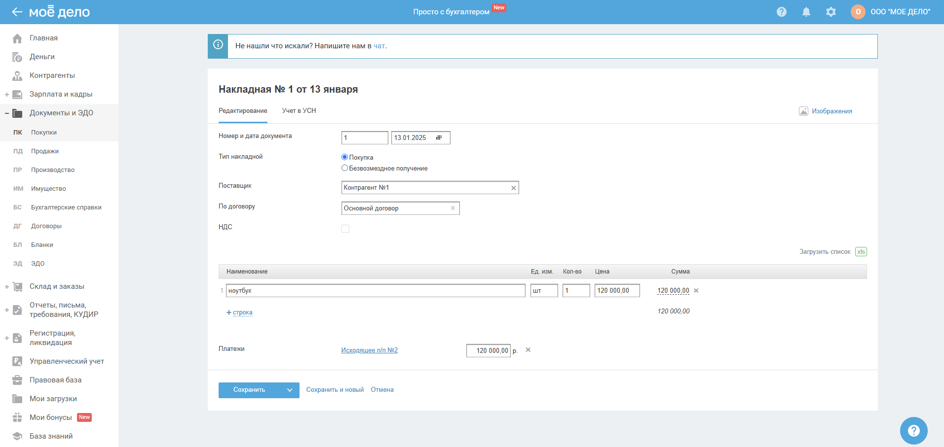 Дополнительно для ООО. При сохранении можете нажать «Сохранить и перейти в учёт», чтобы посмотреть проводки для бух. учёта.