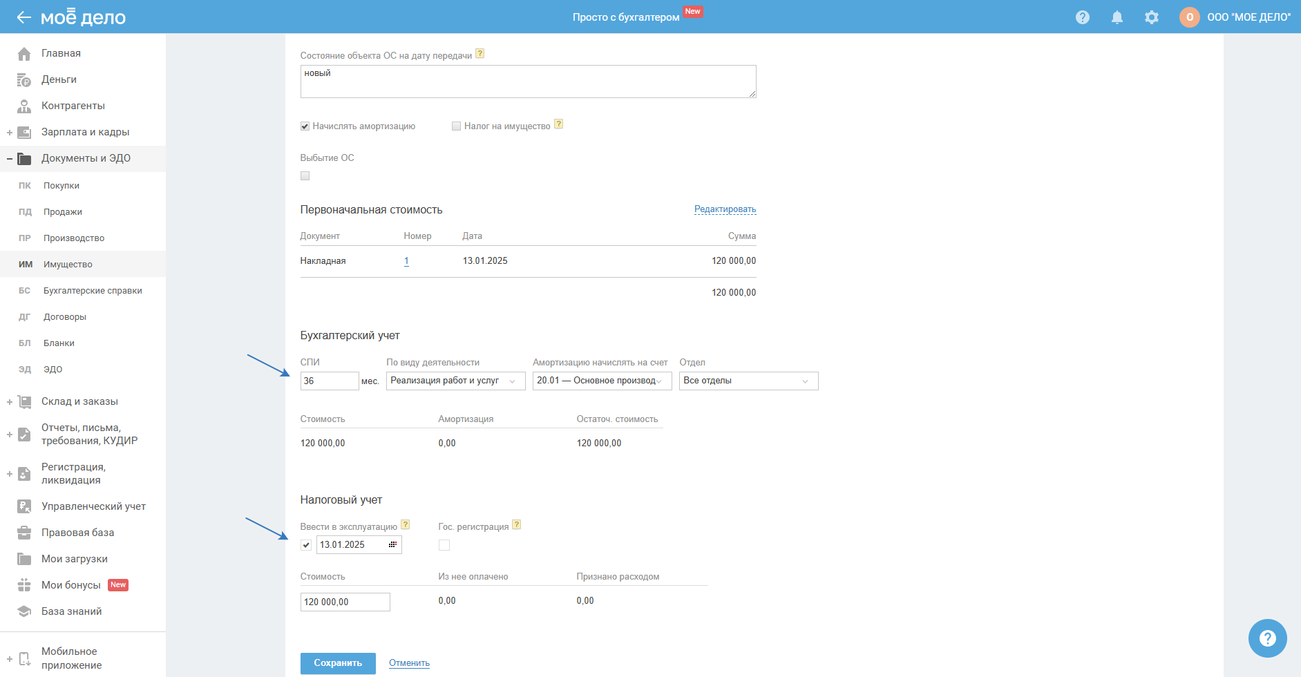 Если имущество стоит более 40 000 р. (если у вас ОСНО стоимость должна быть 40 000 без НДС), но менее либо равно 100 000 р., отразите в сервисе покупку следующим образом: