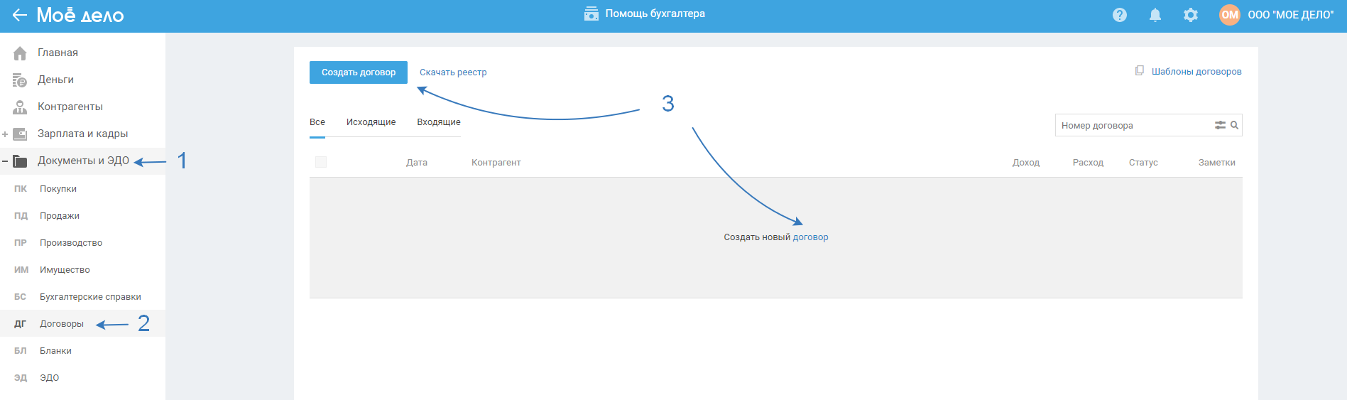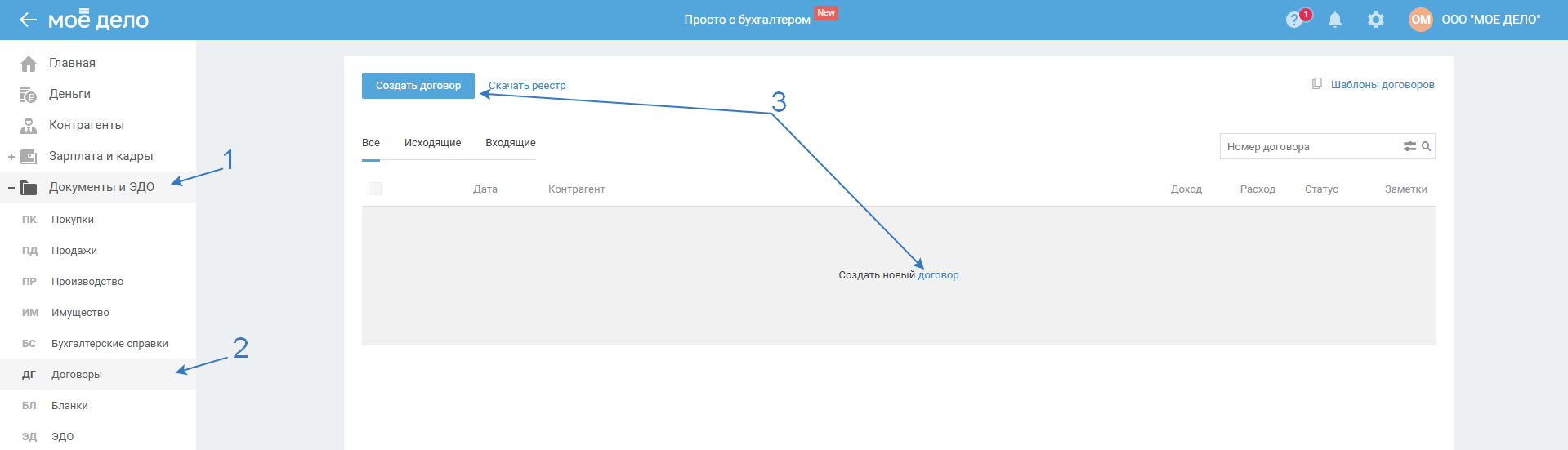 Отразите агентский (посреднический) договор в разделе «Документы и ЭДО» — «Договоры»: