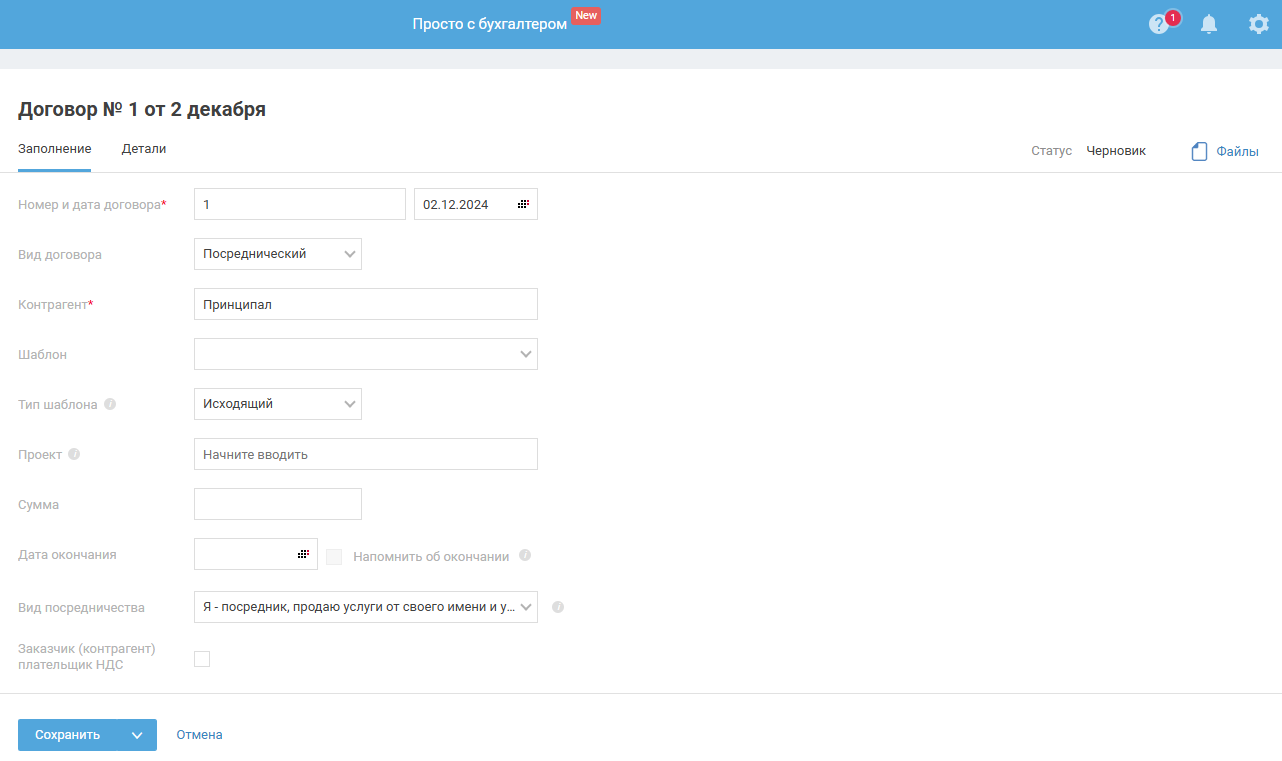 6) В поле «Посреднический договор» выберите договор, заключенный с принципалом (чьи услуги вы продаёте), который создавали в п. 1.