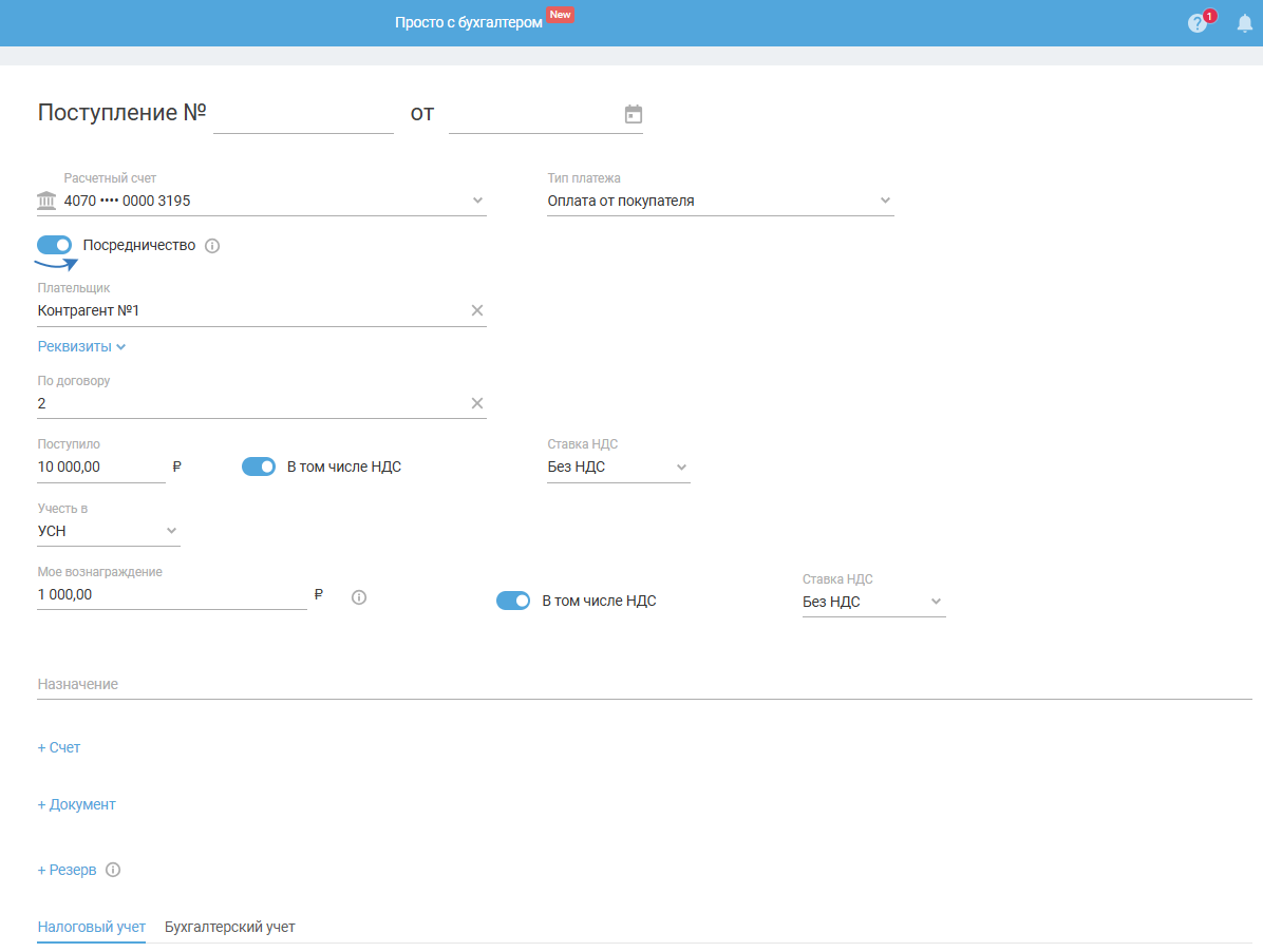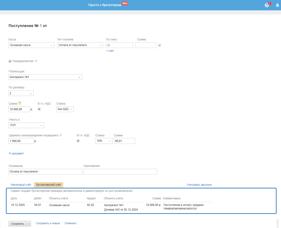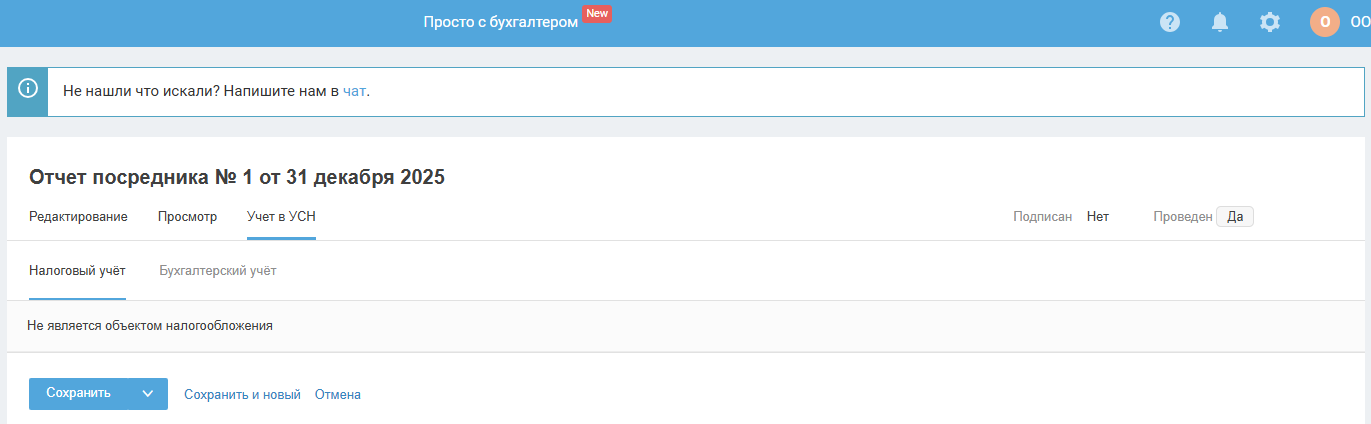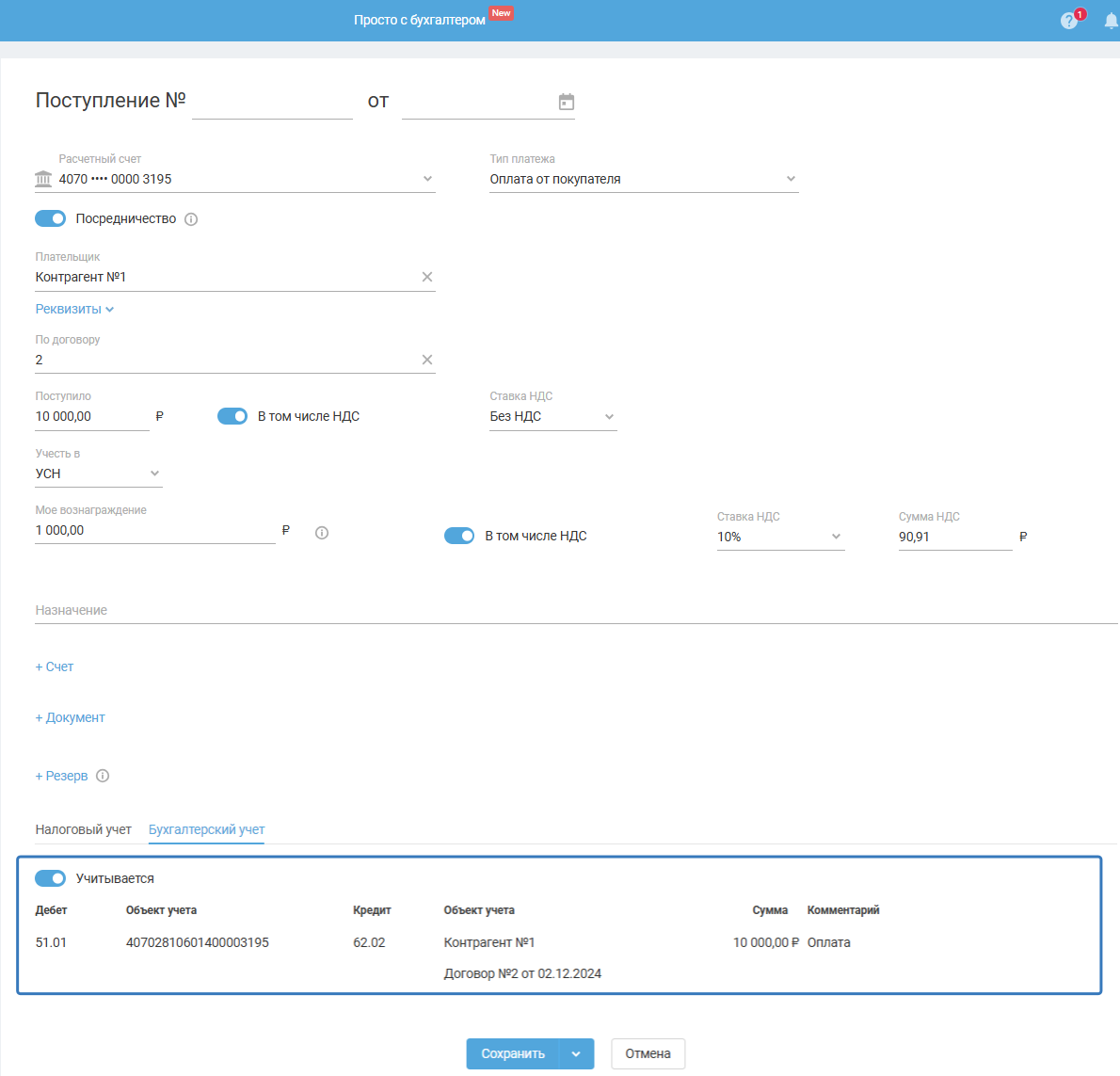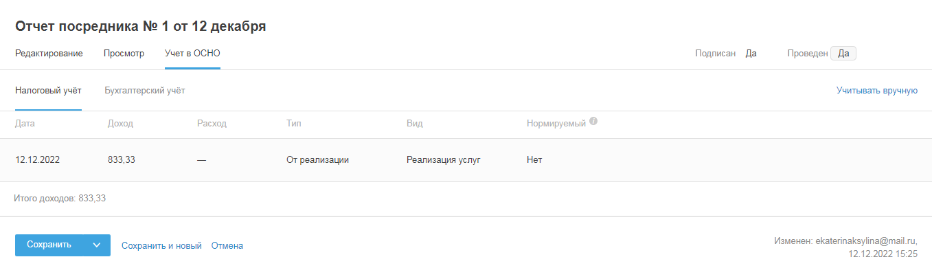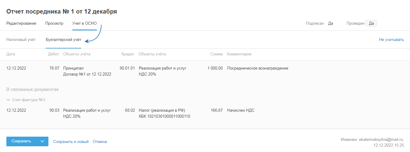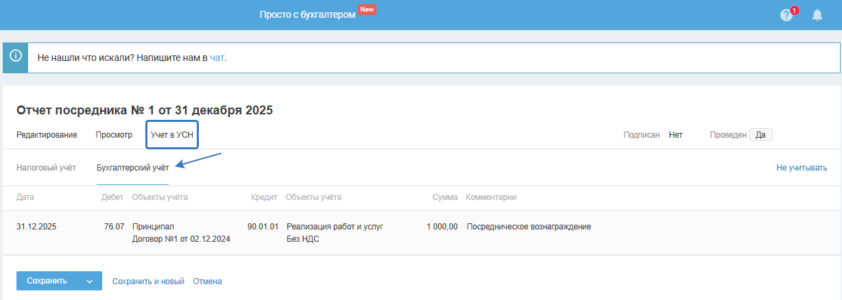 После сохранения отчёта посредника в блоке «Учёт» можете убедиться, что в бух. учёте создастся доход только в виде вашего вознаграждения: