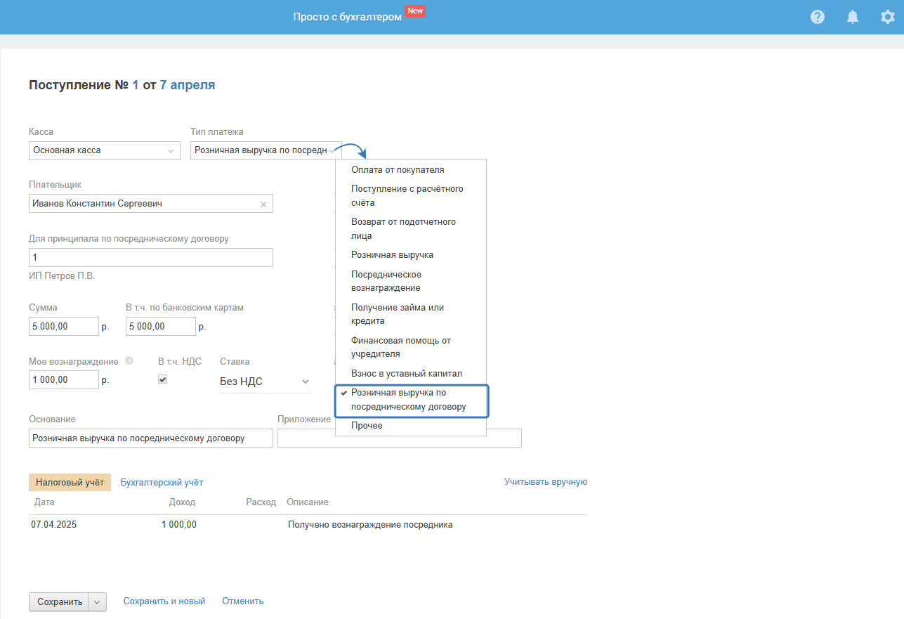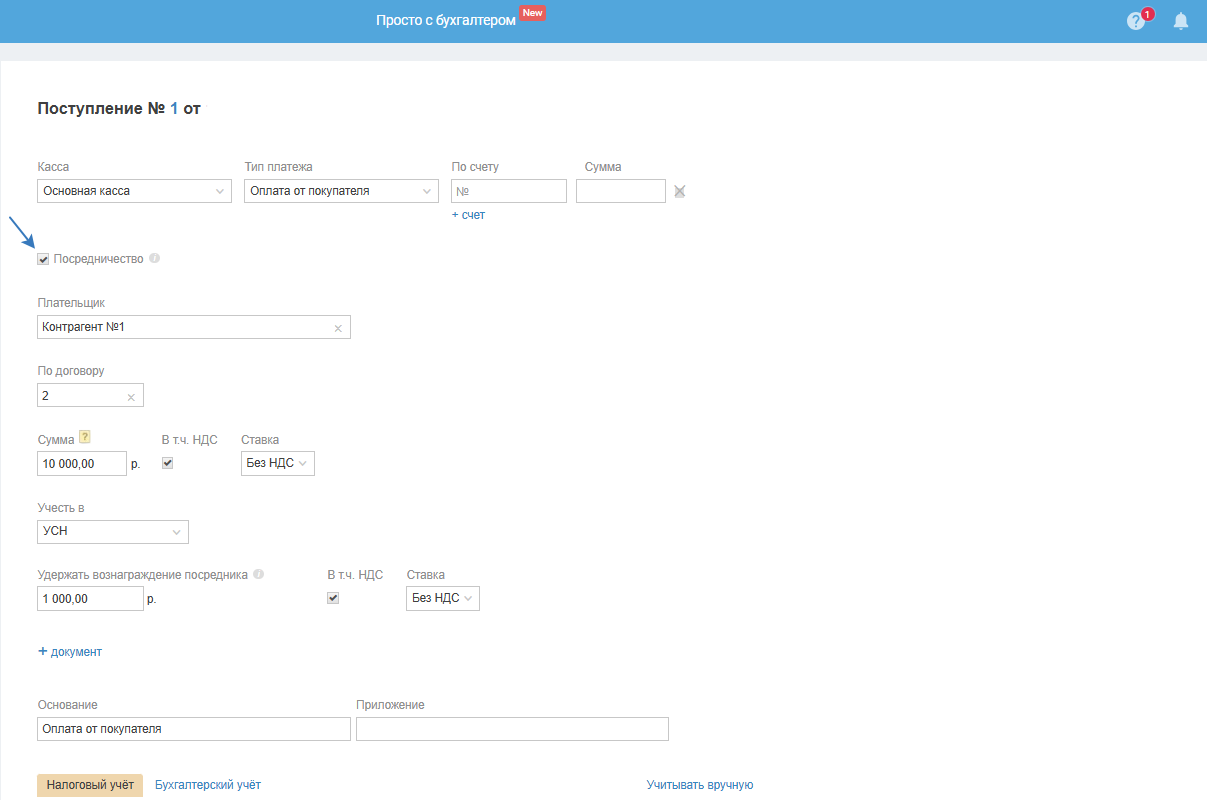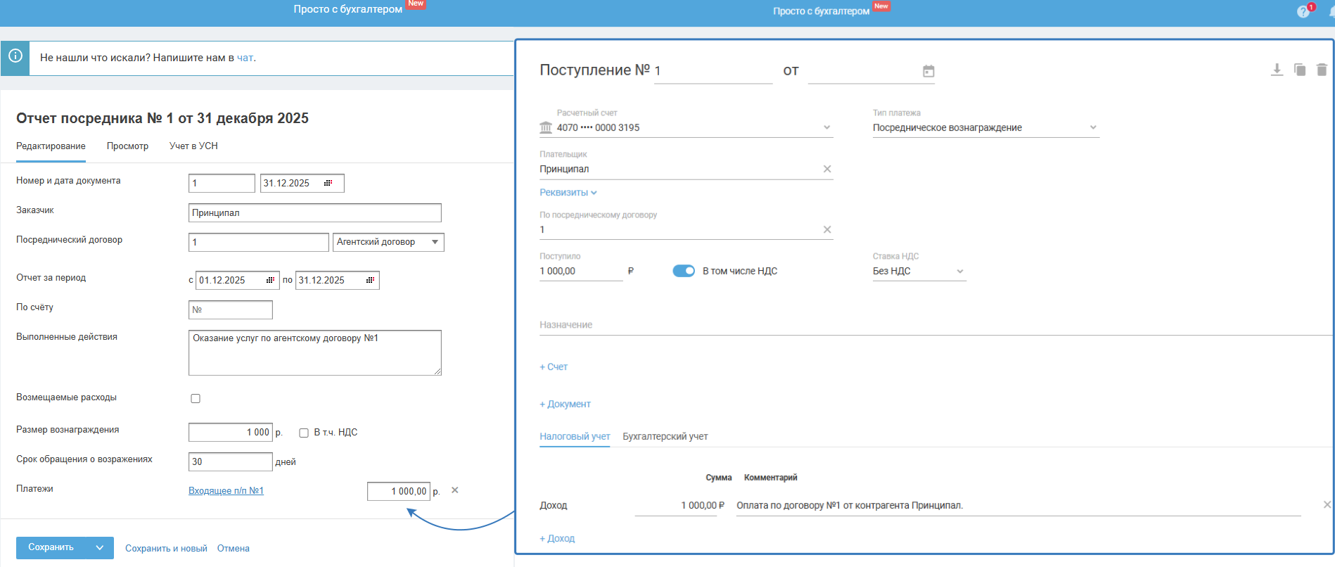 Если вознаграждение вы не удерживали при получении выручки от покупателя, а получали отдельным платежом от принципала, то в отчёт посредника добавьте платёж из раздела «Деньги — Поступление — Посредническое вознаграждение»: