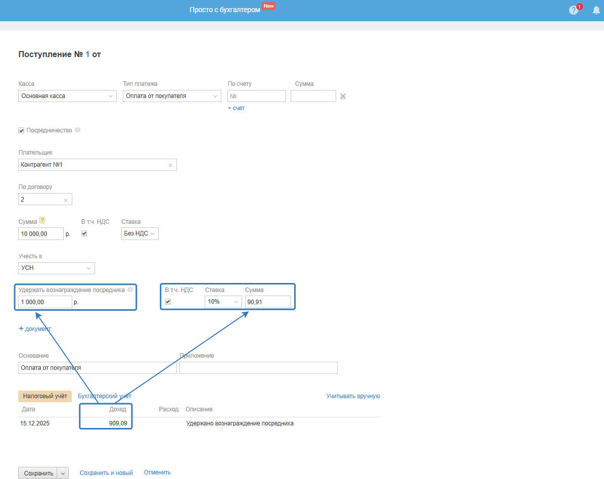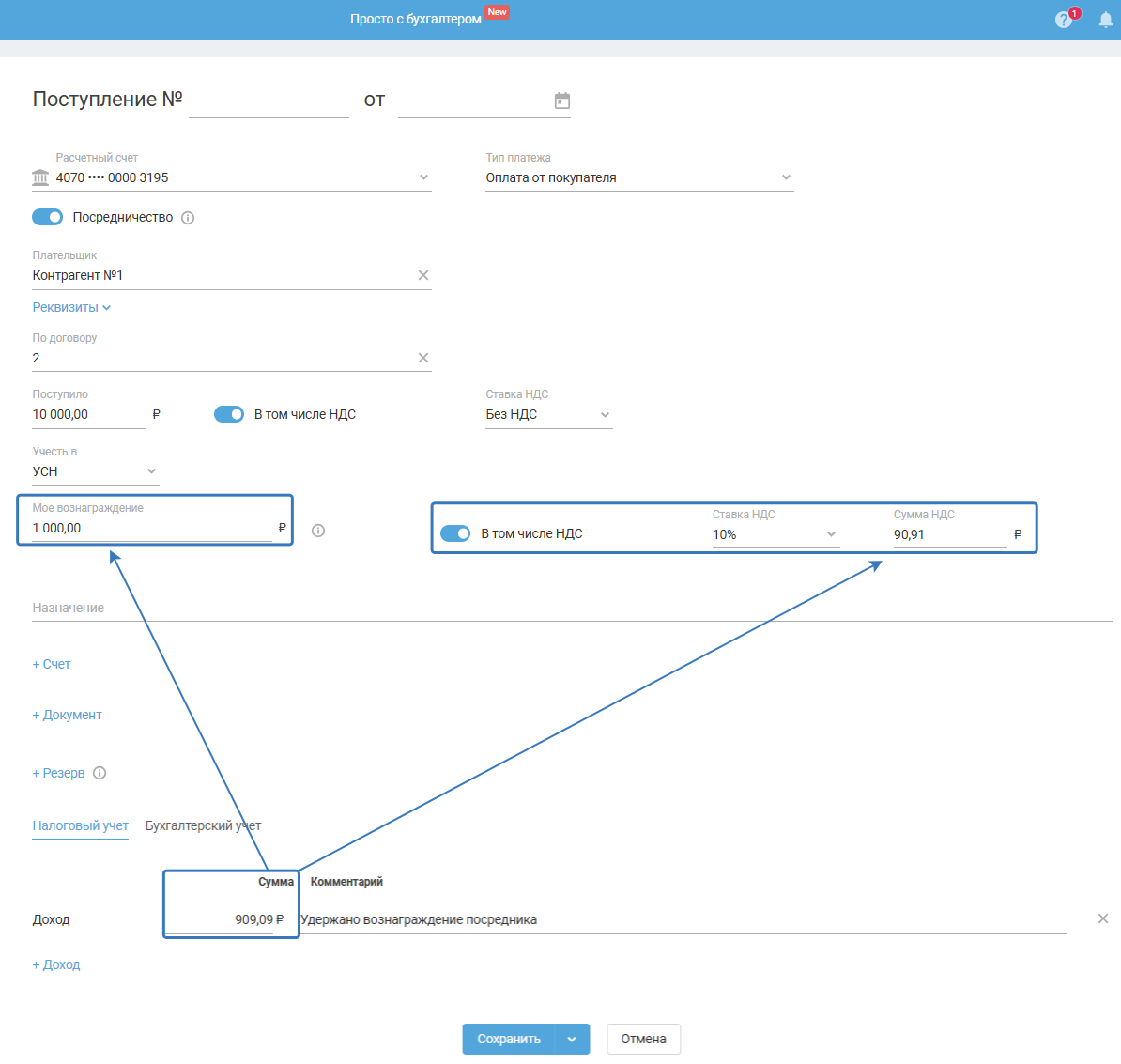 – Удержать вознаграждение посредника. Укажите сумму, если по условию посреднического договора комиссия посредника удерживается в момент поступления денежных средств от покупателя. Эта сумма будет учтена как доход в УСН за минусом суммы, выделенной по НДС с вознаграждения.
