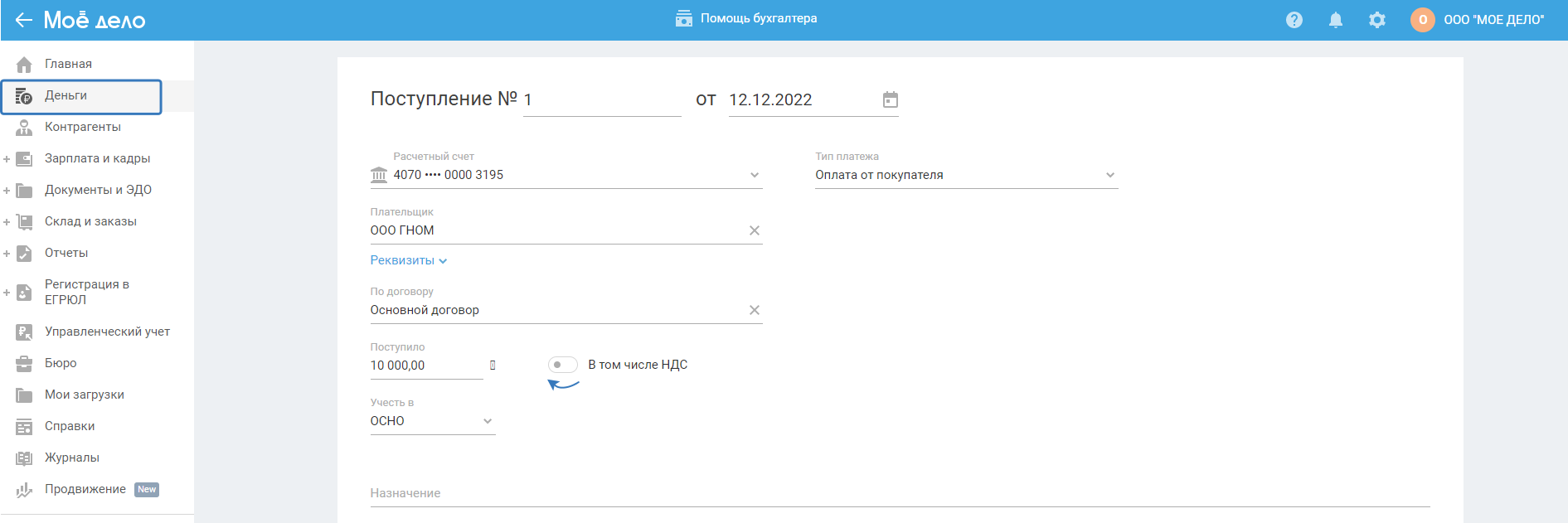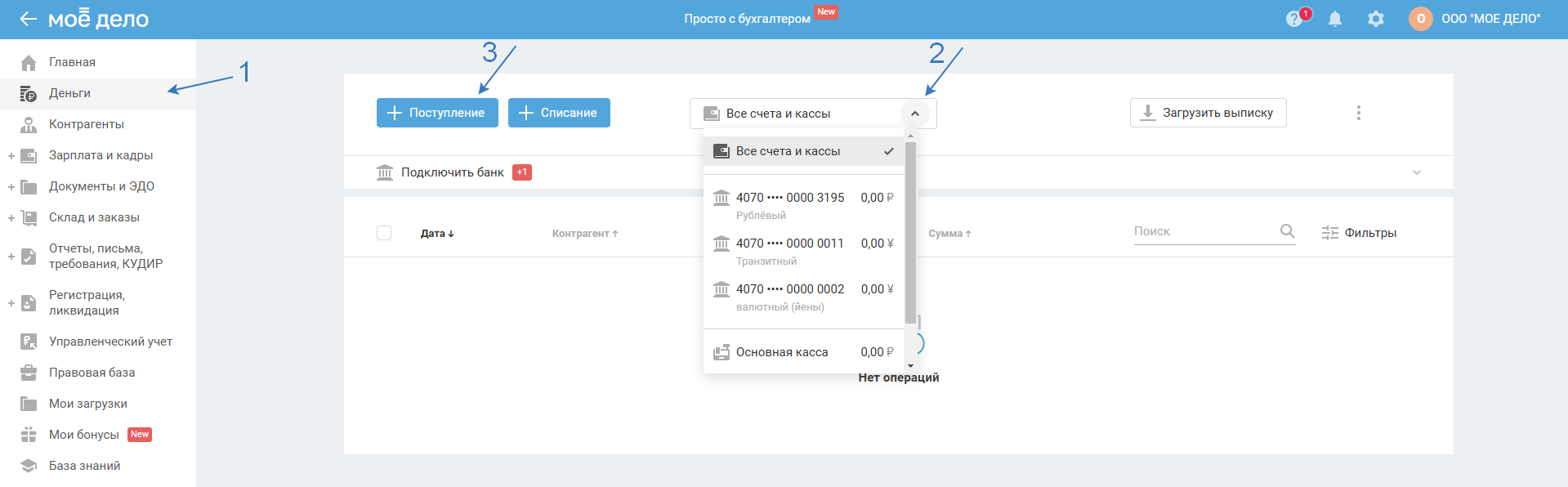 Поступление денег от клиента отражайте в разделе «Деньги» с типом поступления «Оплата от покупателя».