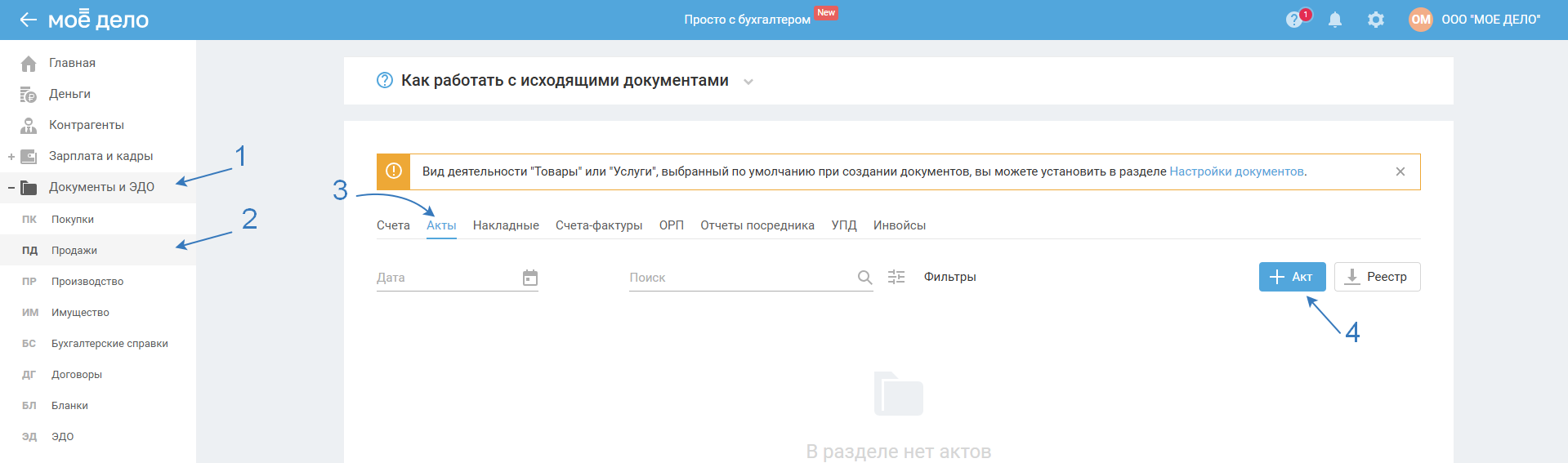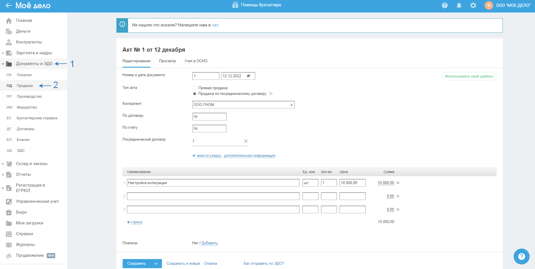 В разделе «Документы и ЭДО — Продажи — Акты» внесите акт для покупателя, где: