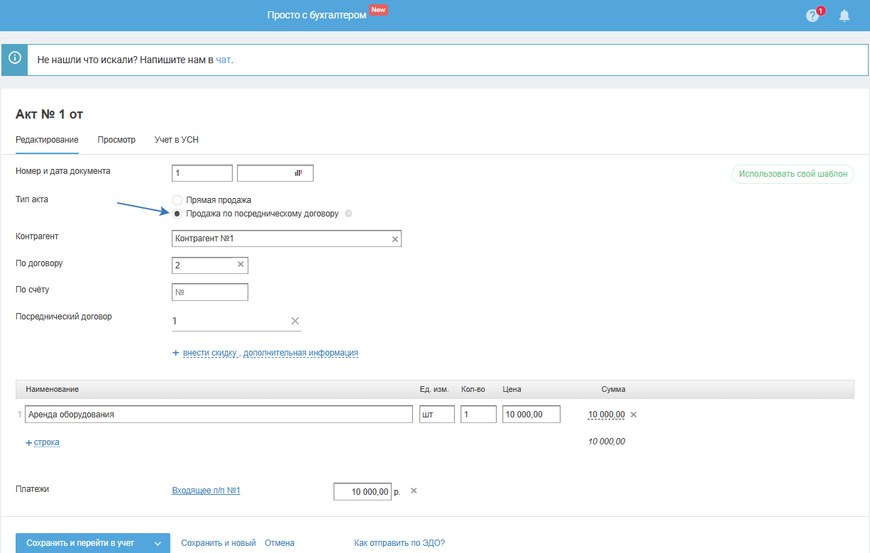 Во вкладке «Документы и ЭДО — Продажи — Акты» внесите акт для покупателя:
