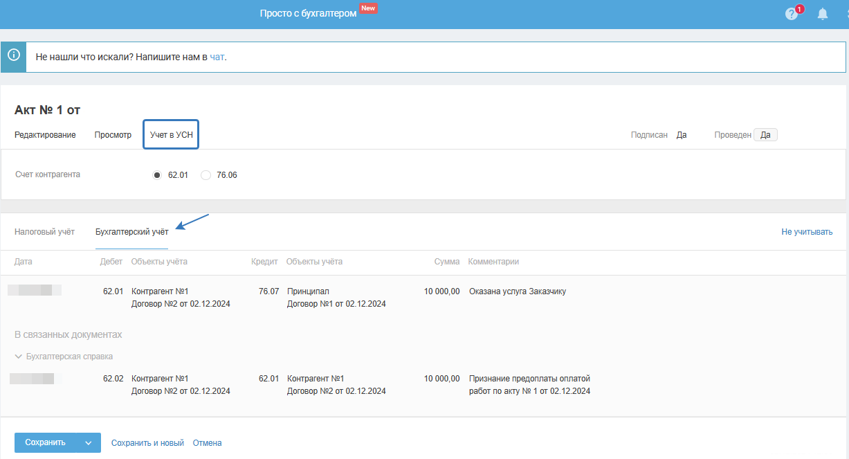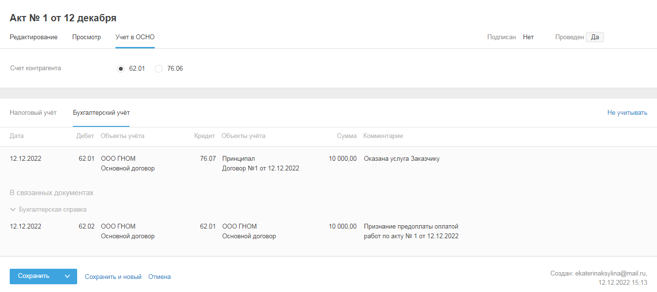 После сохранения акта в блоке «Учёт» будут созданы автоматически проводки об оказании услуги и зачёте аванса в счёт оказанной услуги. Менять проводки не нужно, они создаются автоматически: