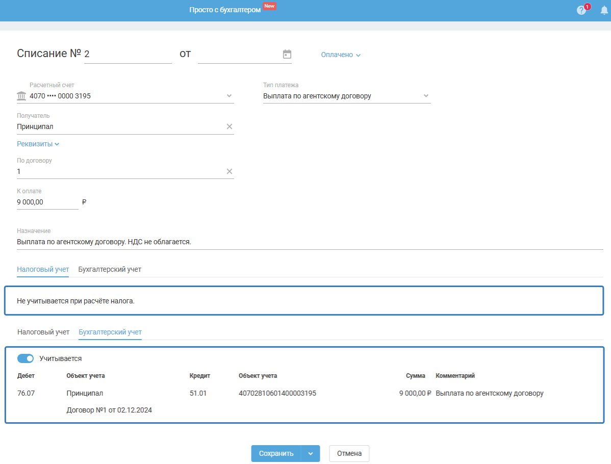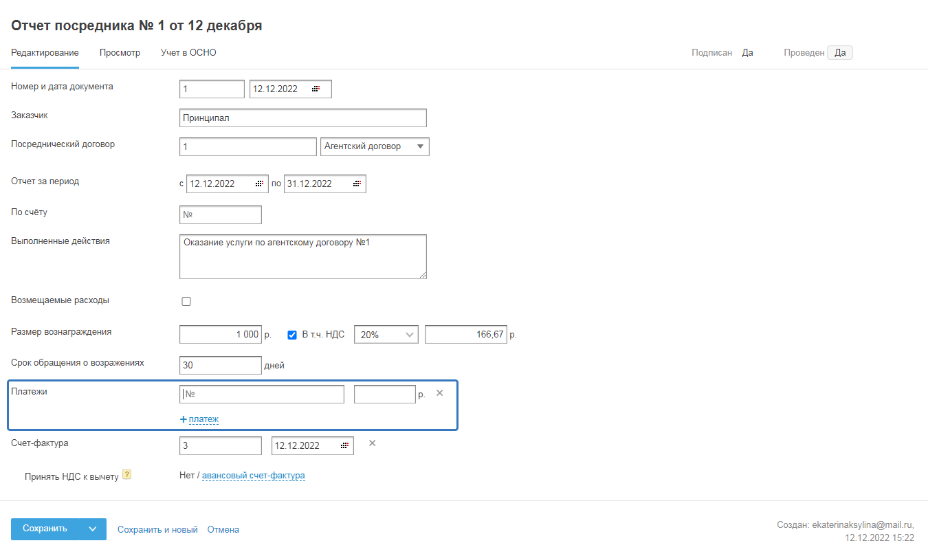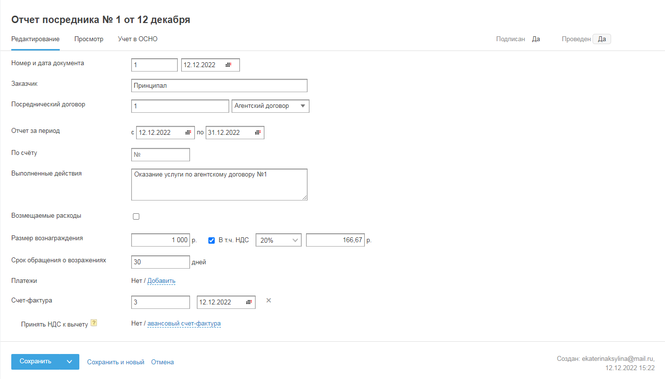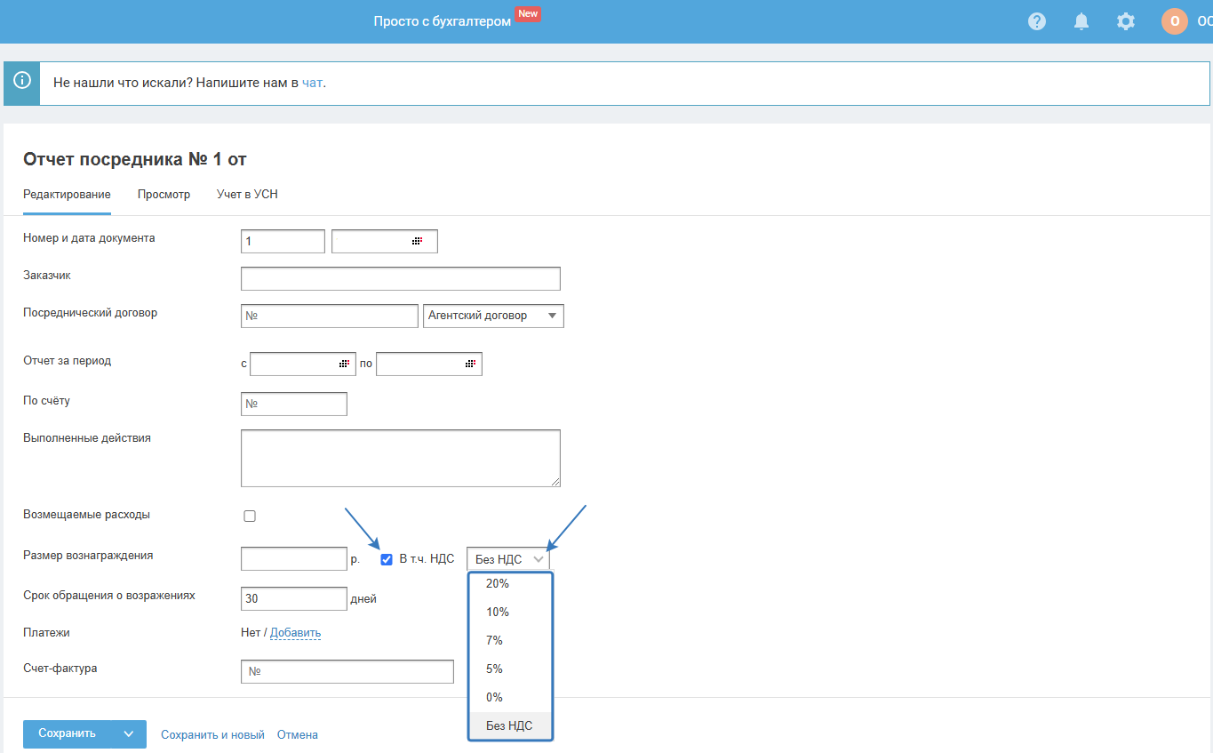 НДС. Чекбокс по умолчанию выключен. При необходимости выделения НДС включите чекбокс и выберите ставку. Сумма НДС рассчитается автоматически по указанной процентной ставке, далее заполните реквизиты (дату и номер) счёта-фактуры, выставляемой вами в адрес принципала (комитента).