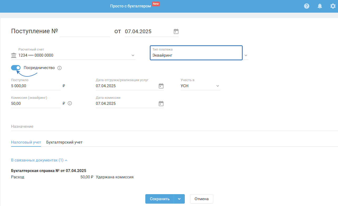 2) Далее создайте операцию по р/сч с типом «Эквайринг» с включенным тумблером «Посредничество».