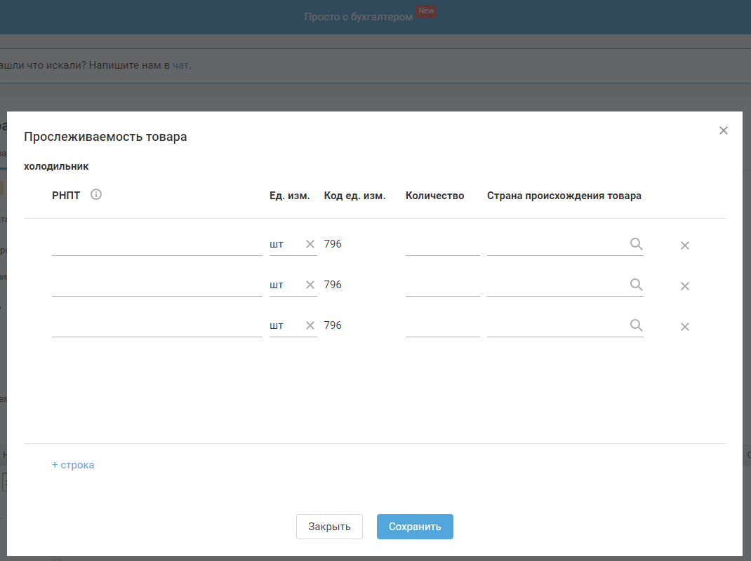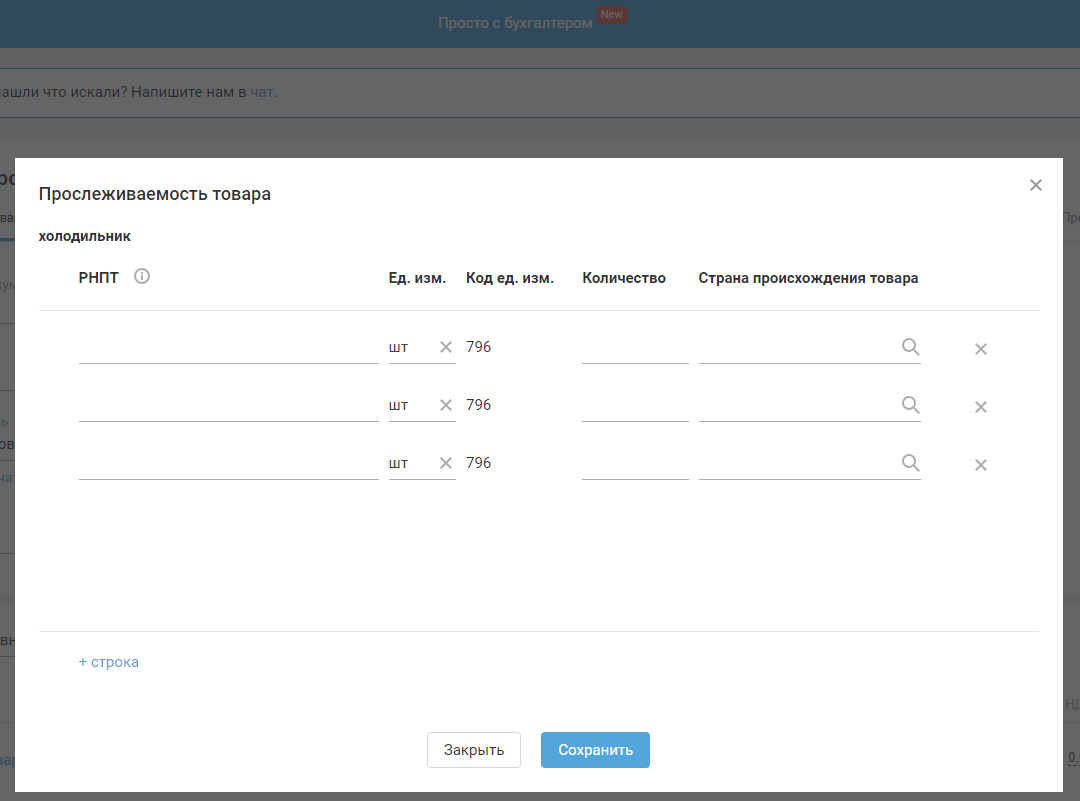 В случае приобретения товара/материала, который состоит из прослеживаемых товаров, вам необходимо заполнить строчки по каждому прослеживаемому товару.