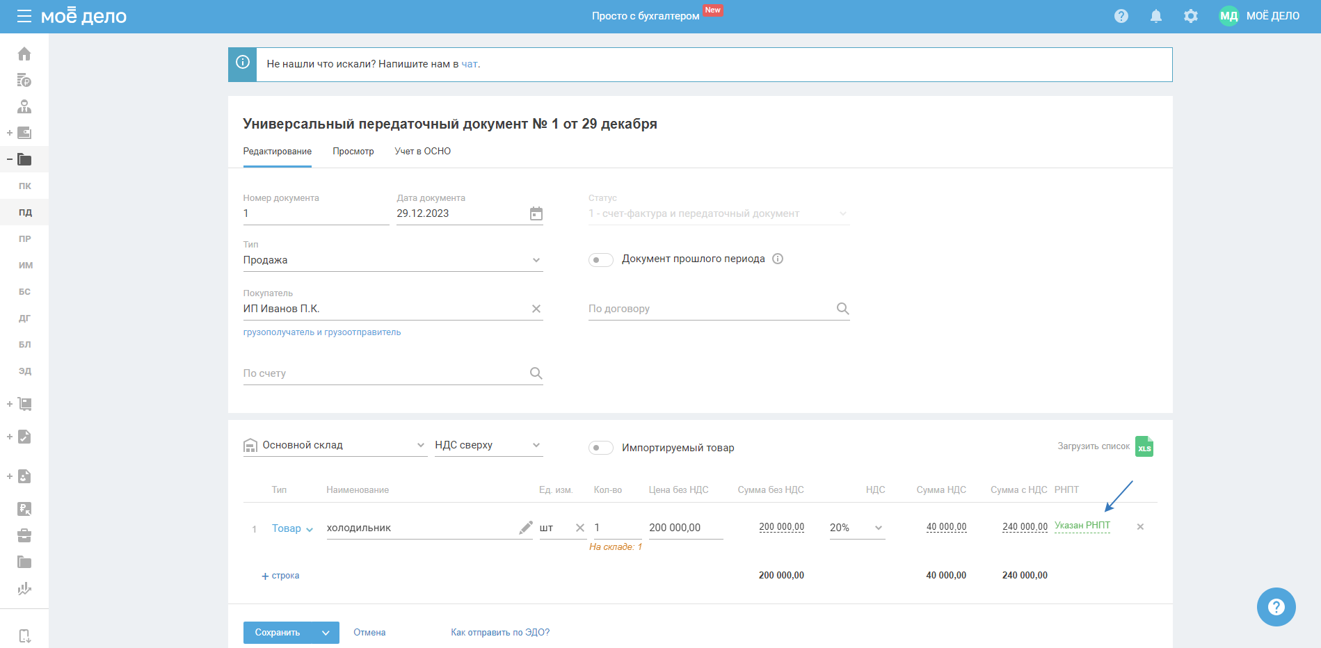После сохранения данных о прослеживаемости товара в столбце будет прописано, что «Указан РНПТ»: