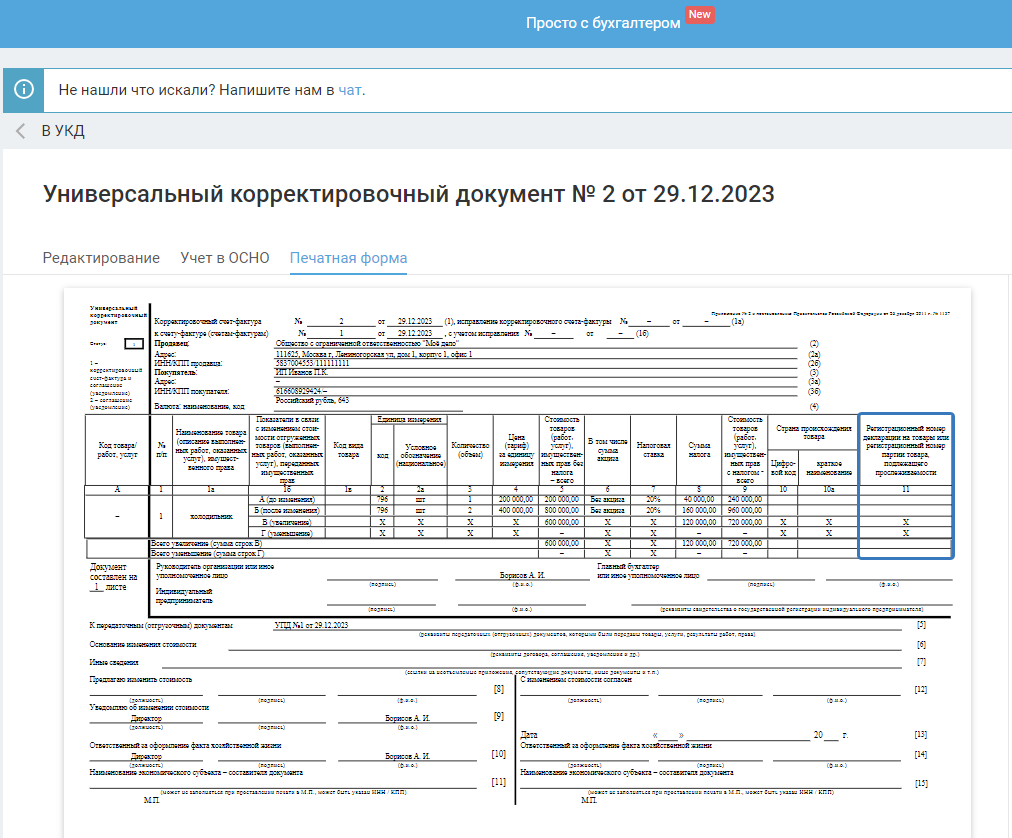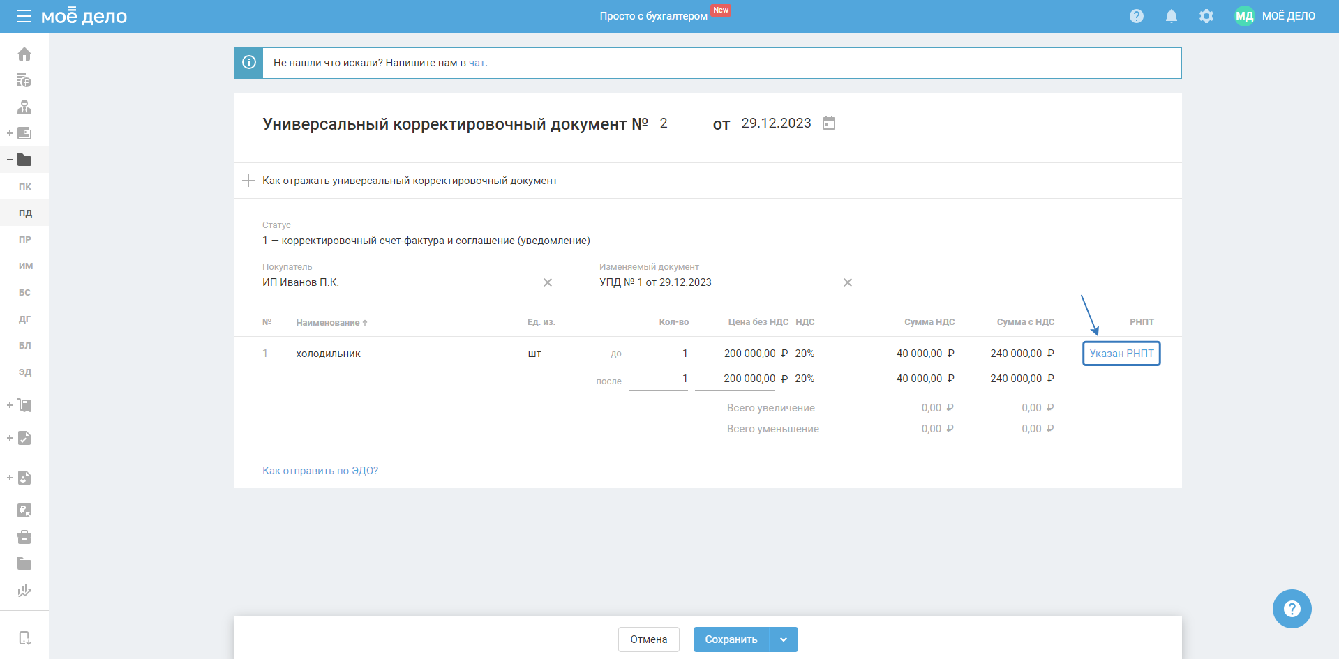 В открывшемся окне по умолчанию заполнены одинаковыми данными строки «До» и «После» изменения, полученными из УПД.
