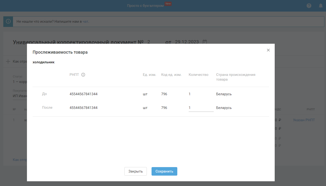 При необходимости вы можете изменить только поле «Количество» в строке «После» изменения. Строки «До» изменения, а так же строки «После» изменения, а именно: Номер РНПТ, Ед. изм, Код. ед. изм., Страна происхождения товара, полученные из УПД недоступны для редактирования: