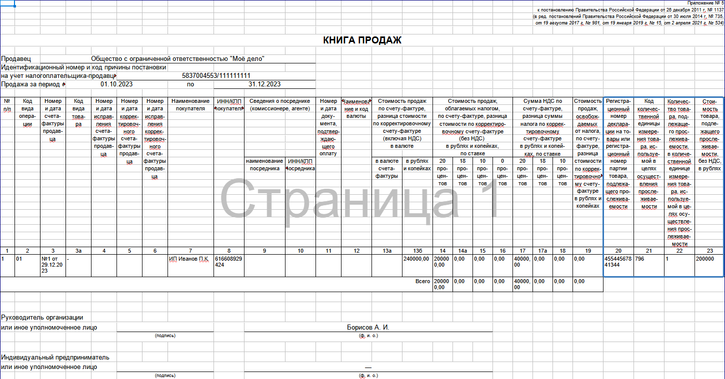 В печатной форме в книге продаж в столбцах 20-23 заполняется информация по товарам с прослеживаемостью:
