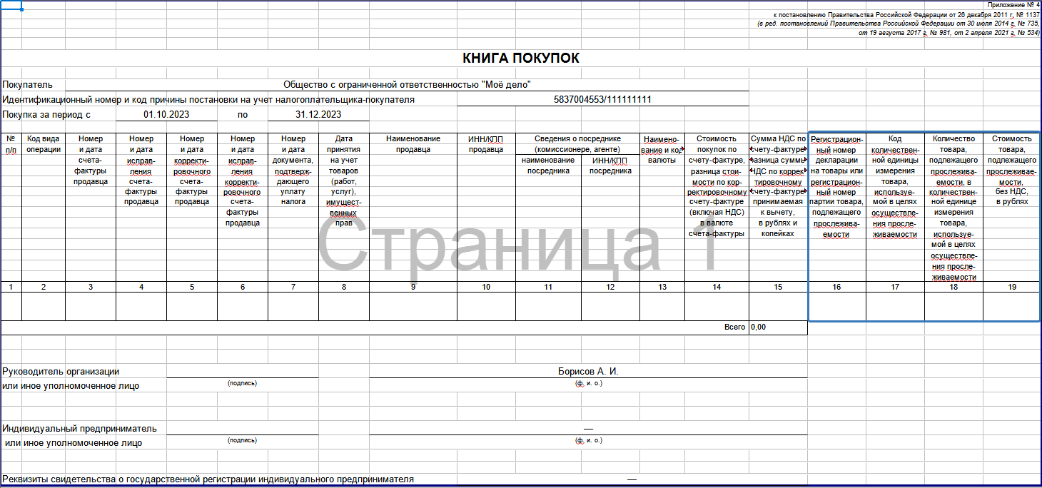 В печатной форме в книге покупок в столбцах 16-19 заполняется информация по товарам с прослеживаемостью:
