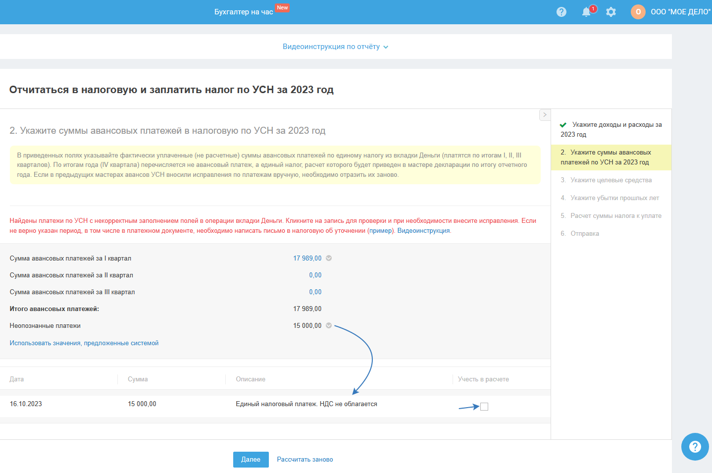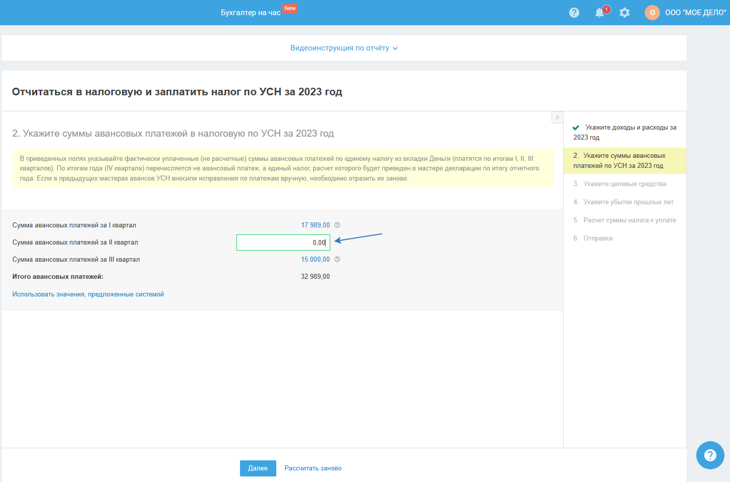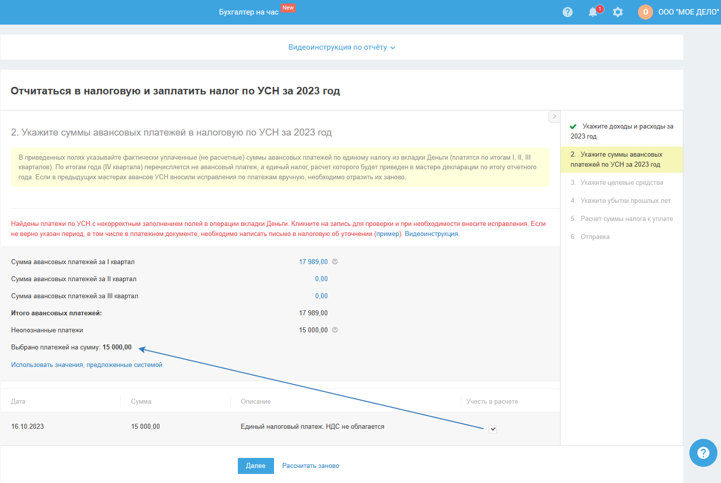Если данные не отобразились, то для корректного расчёта отразите (исправьте) уплату авансового платежа во вкладке «Деньги» — «Бюджетный платёж». Также данные об уплате вы можете внести в самом шаге, кликнув на сумму в нужном квартале: