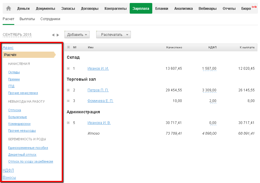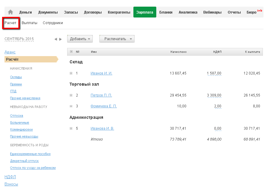 Для расчета сумм, причитающихся к выплате работникам и внебюджетным фондам в разделе Зарплата используется подраздел "Расчет". Он доступен на тарифах для ИП работодателей и организаций.