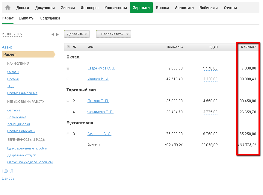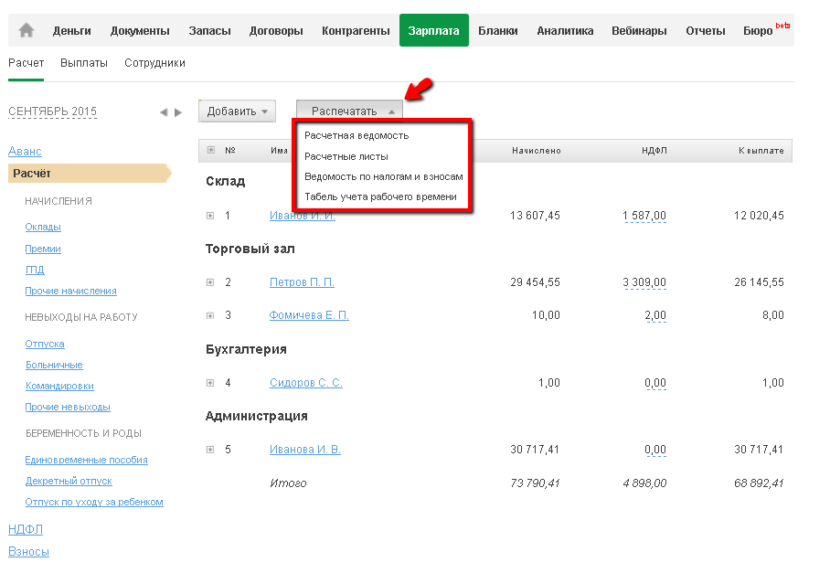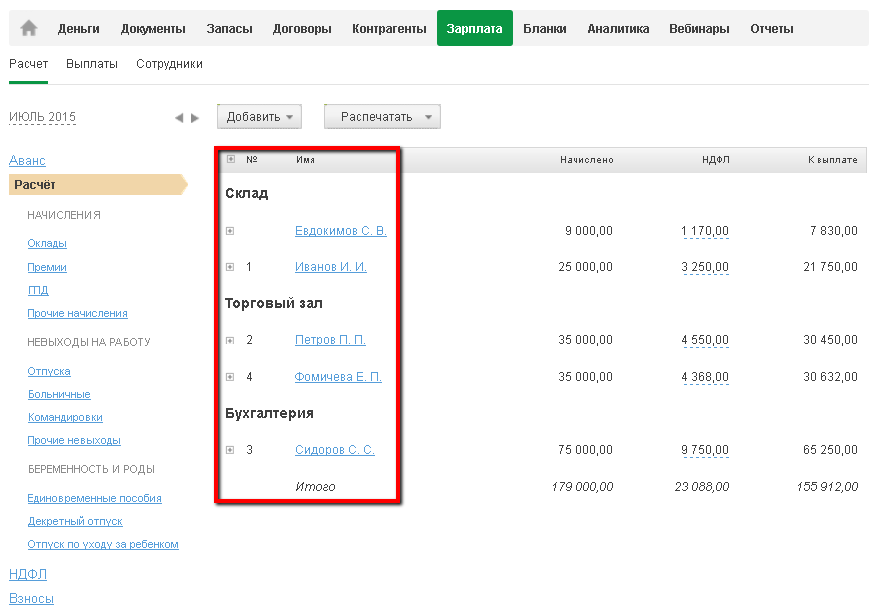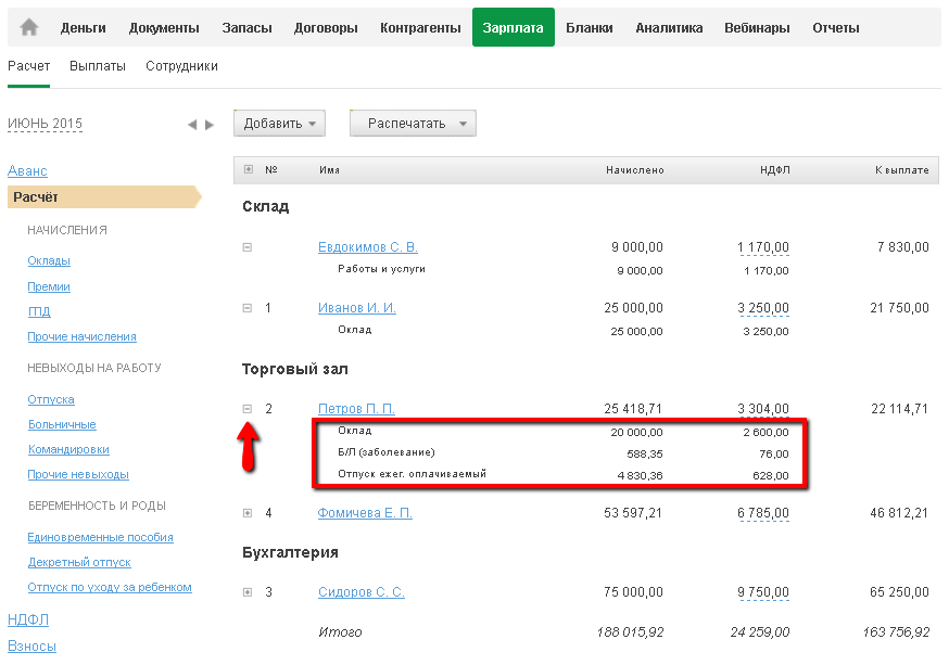Сумма по графе "Начислено" формируется из всех начислений по работникам за расчетный месяц, таких как (оклад, больничные, отпускные, пособия по нетрудоспособности и беременности и родам, единовременные пособия и т.д.). Просмотреть их можно нажав на кнопку возле фамилии работника.
