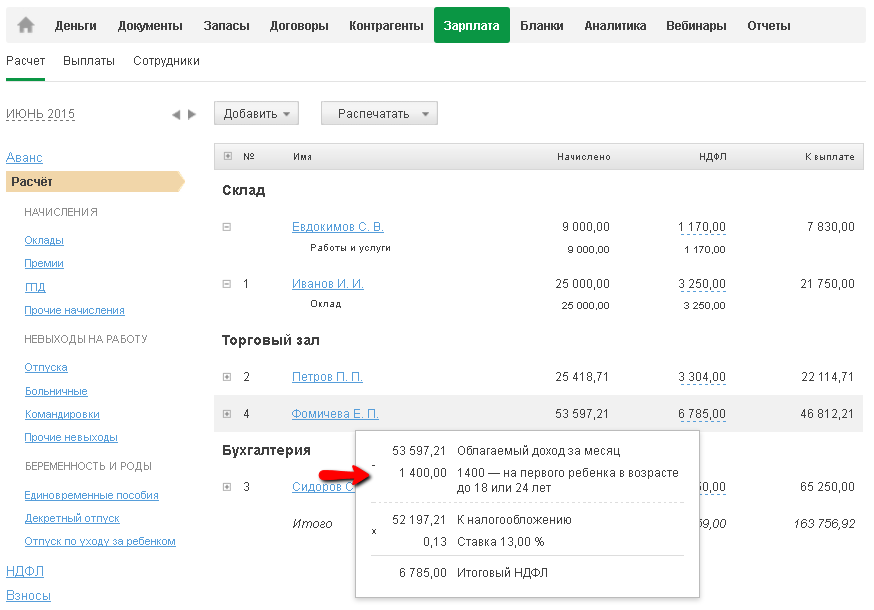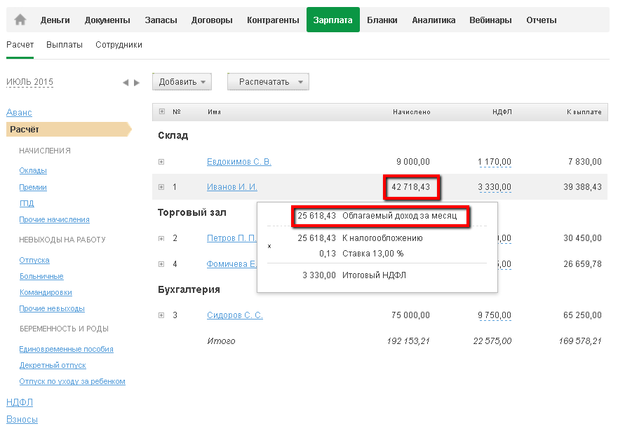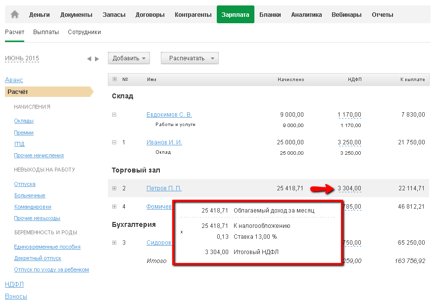 Посмотреть формулу расчета НДФЛ за просматриваемый месяц можно, нажав на активную ссылку суммы по графе "НДФЛ".