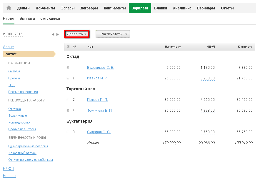 Для расчета данных этого раздела используется информация по всем начислениям, отраженным по работникам в сервисе. Как их добавить см.в инструкцию к подразделу Сотрудники. Кроме того начисления по сотрудникам можно создать через кнопку "Добавить".