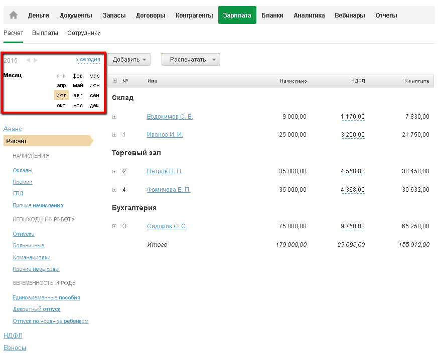 Все данные показываются в разрезе каждого отдельного расчетного месяца, который можно менять вручную в левом верхнем углу данной вкладки.