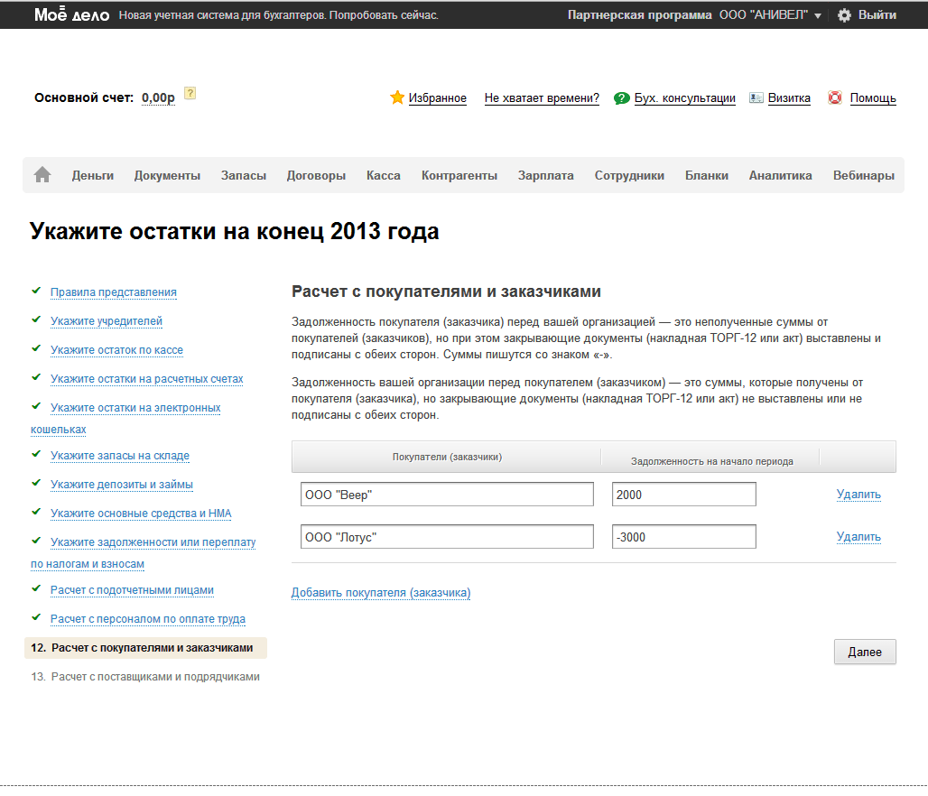 В шаге отразите долги покупателей (заказчика, клиента) со знаком минус и долги перед покупателем (заказчиком, клиентом) вашей организации в виде положительного значения. Данные нужны на 31 декабря.