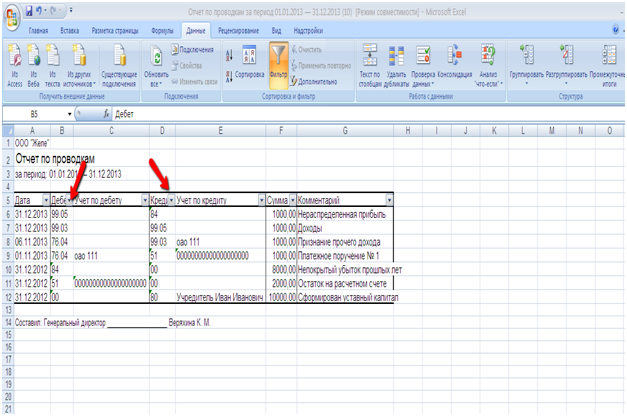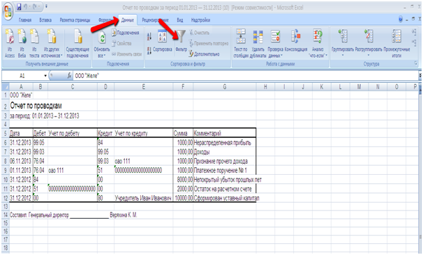 По отчету по проводкам можно посмотреть сам процесс формирования остатков по проверяемым счетам. Для этого в верхней панели отчета по проводкам нажмите на раздел "Данные", там выберите "Фильтр".