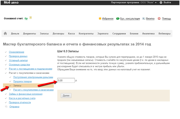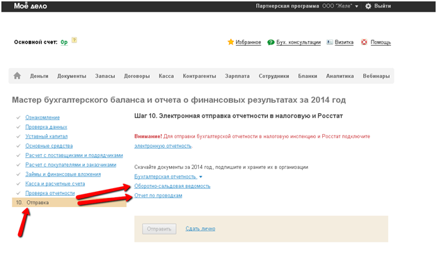 Допустим, в сформированном бухгалтерском балансе Вас смущает строка 1210 "Запасы" в размере 10 тыс. руб. Чтобы определить, как было сформировано значение данной строки, сначала скачиваем отчет по проводкам и оборотно – сальдовую ведомость (в мастере бухгалтерской отчетности на шаге "Отправка").