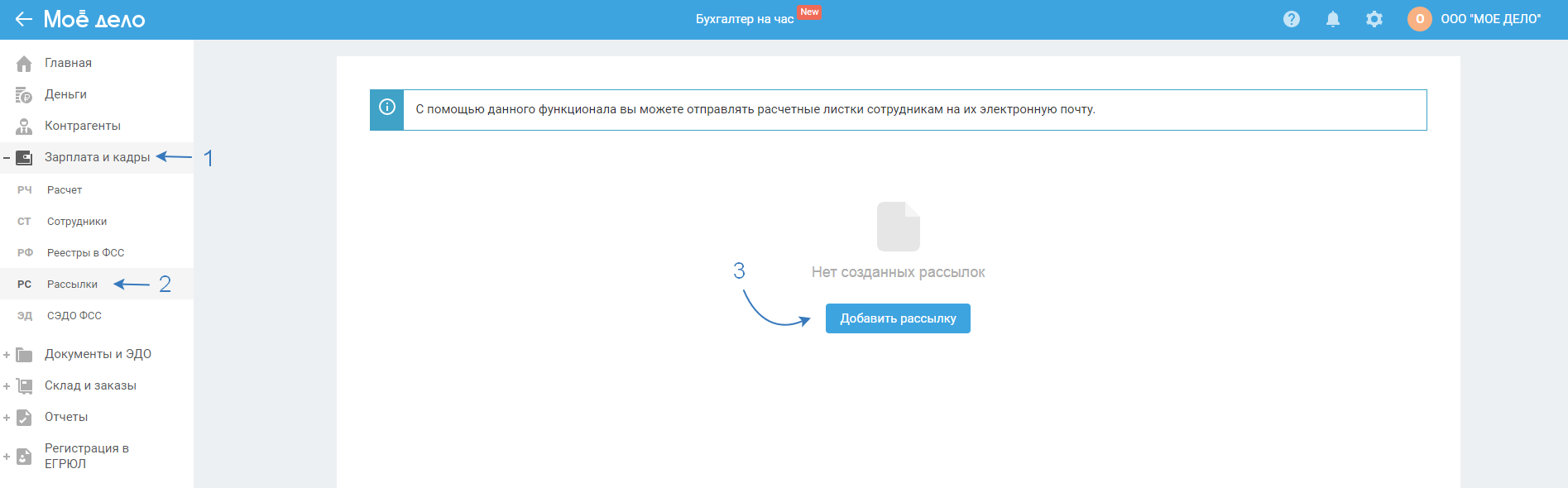 В разделе «Рассылки» вы можете отправить расчётные листки сотрудникам на их электронную почту.