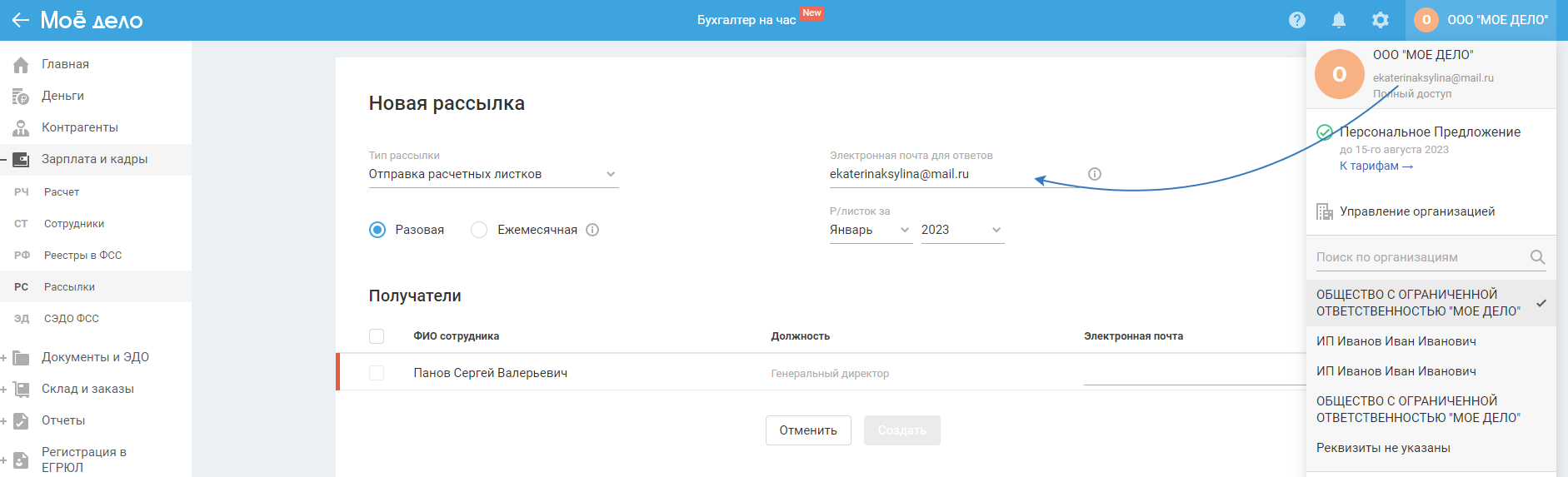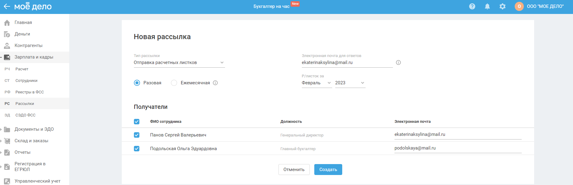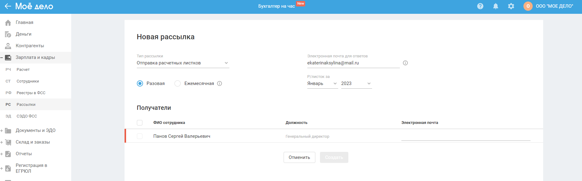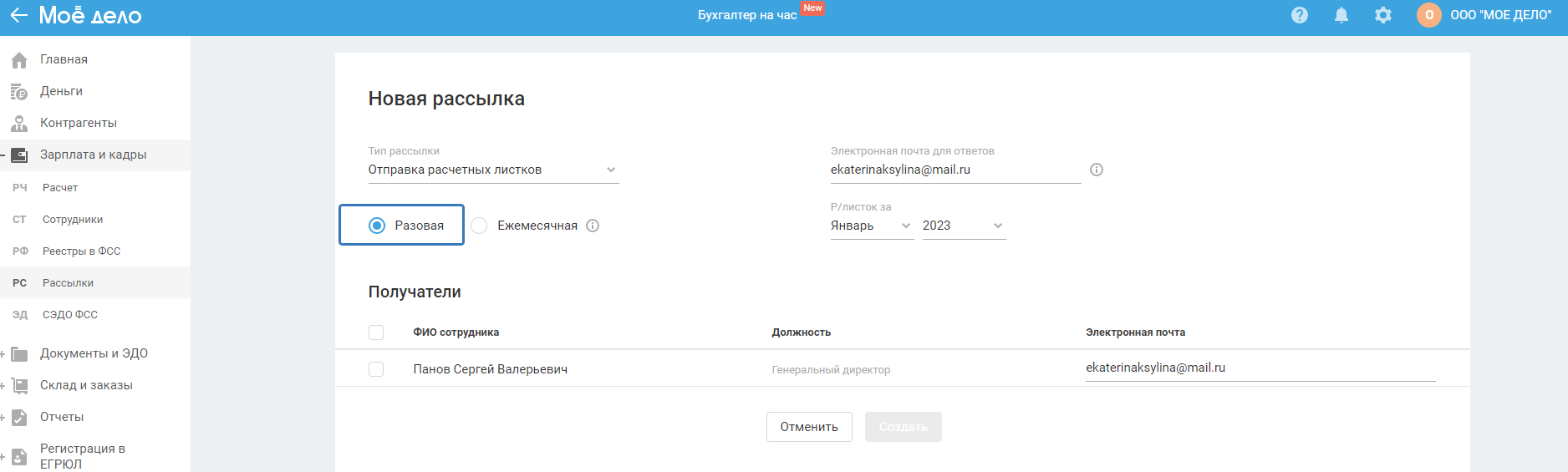 Создание разовой рассылки расчётных листков