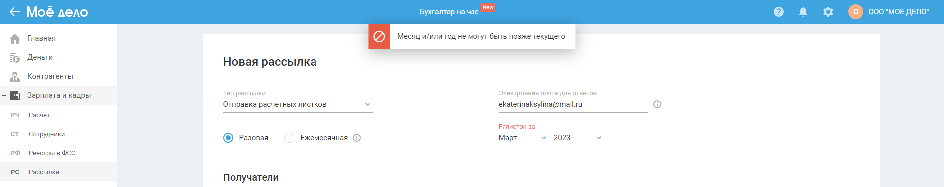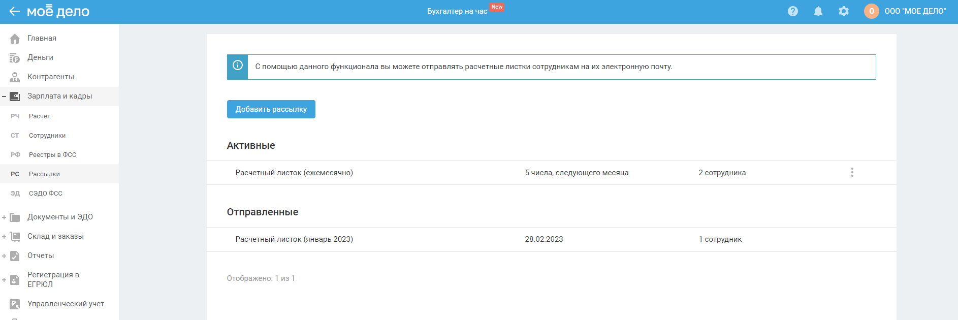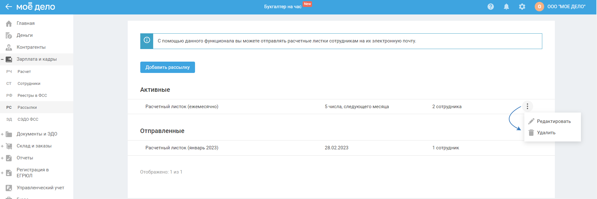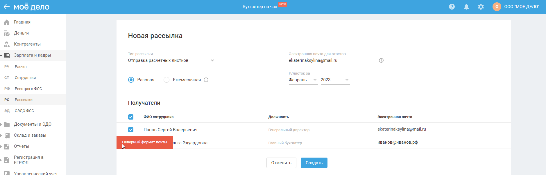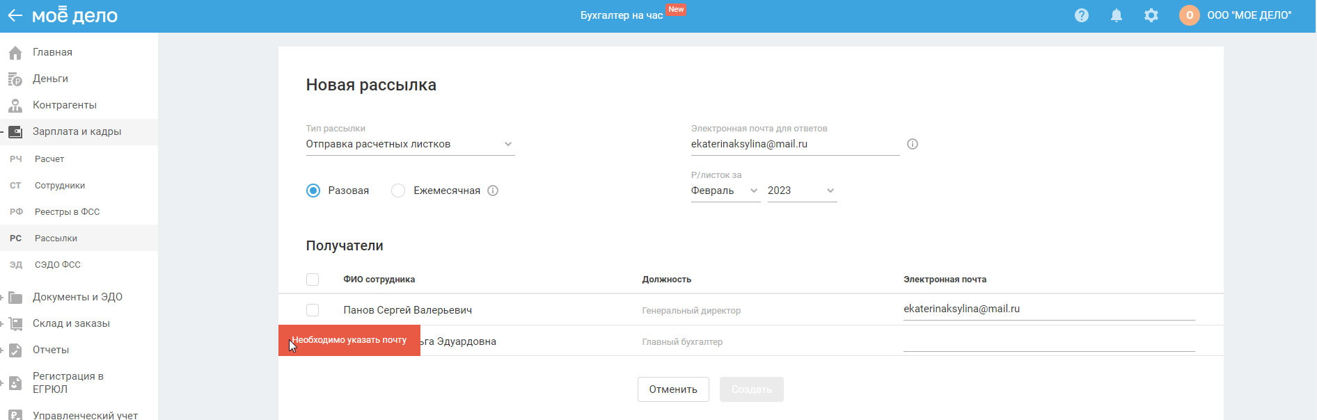Создание разовой рассылки расчётных листков