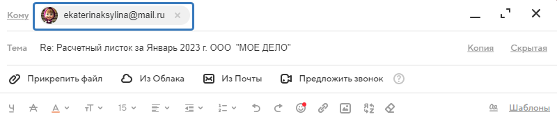 Если сотрудник, получив расчётный листок на свою эл. почту, нажмёт на кнопку «Ответить», тогда в поле «кому» почтового сервиса(программы) будет указан e-mail из поля «Электронная почта для ответов».