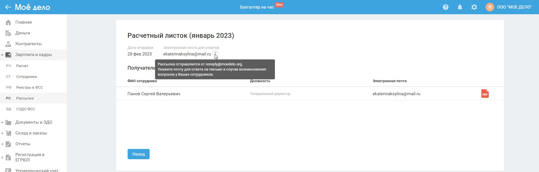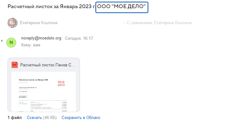 В полученном сотрудником письме с расчётным листком в качестве адреса отправителя будет указываться адрес noreplay@moedelo.org, но на этот адрес нет возможности направить ответное письмо (см. выше).
