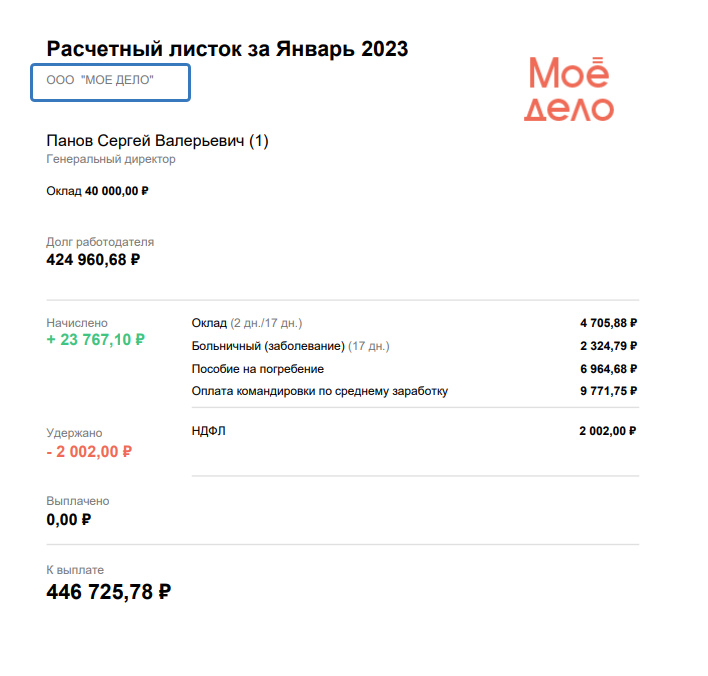 Т.к. сотрудник получит эл. письмо, содержащее расчётный листок, с эл. почты noreplay@moedelo.org, чтобы ему легче было разобраться с реальным отправителем, были добавлены наименования вашей организации: